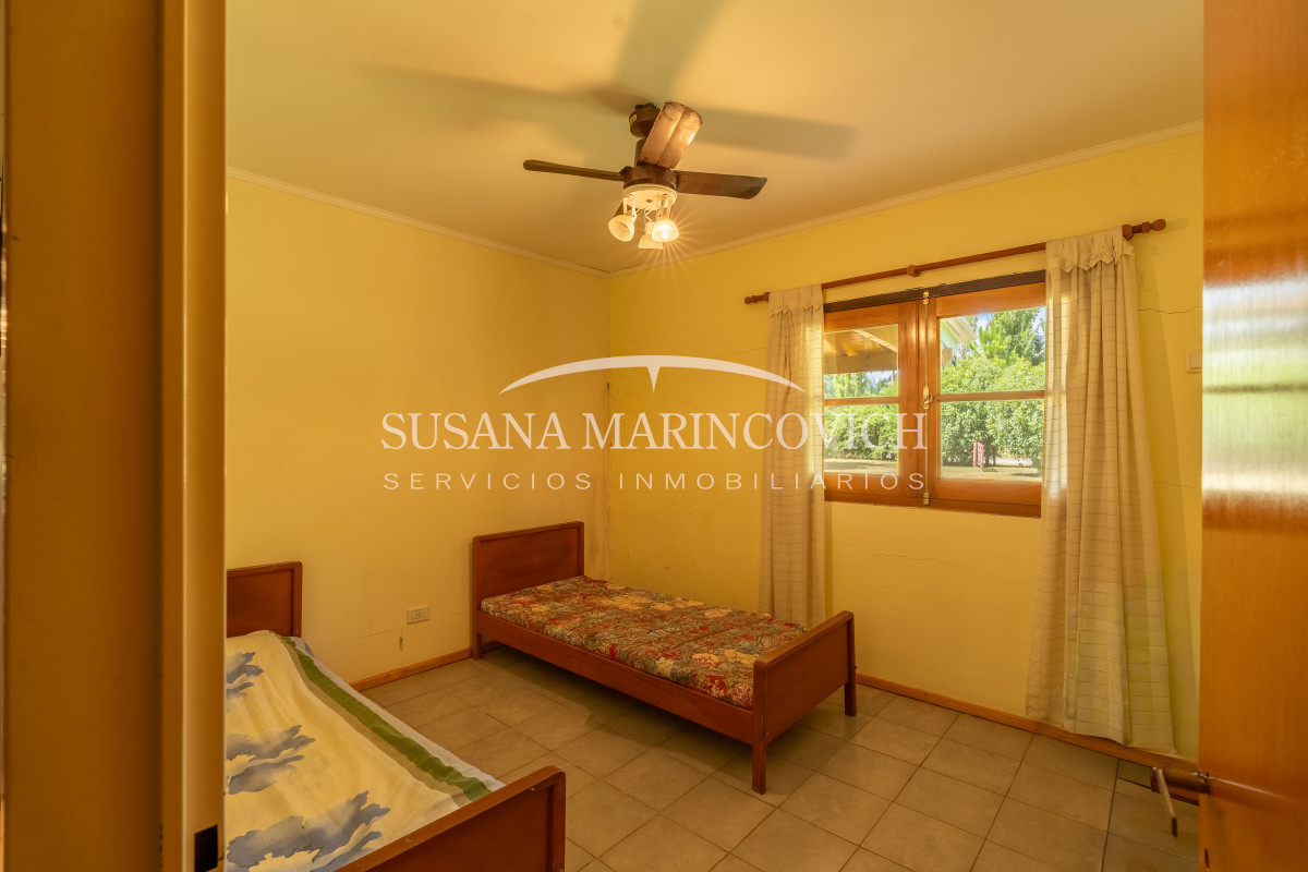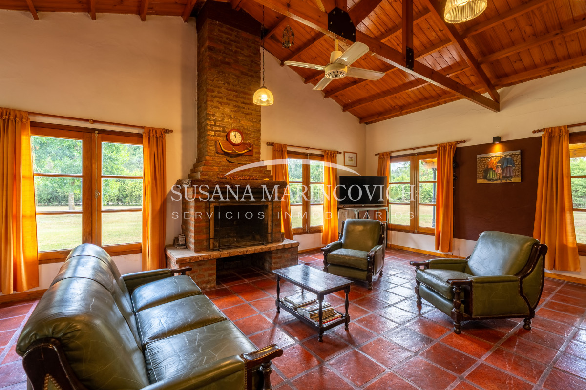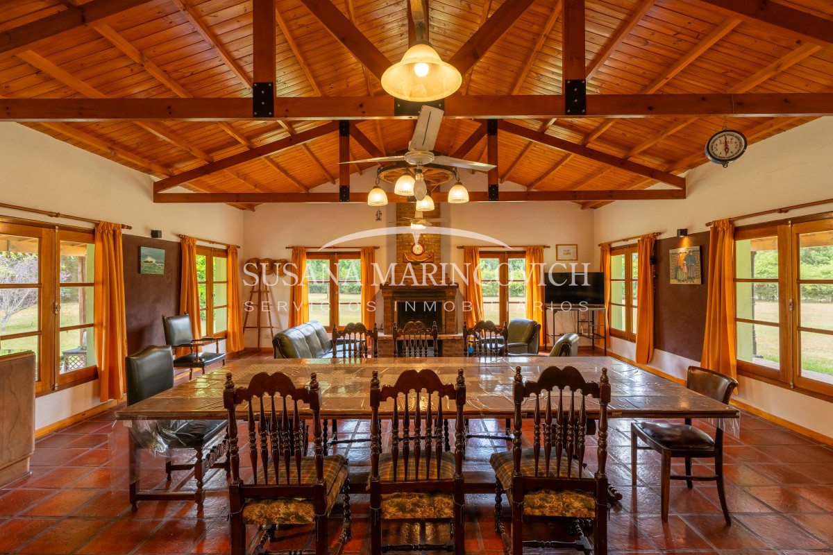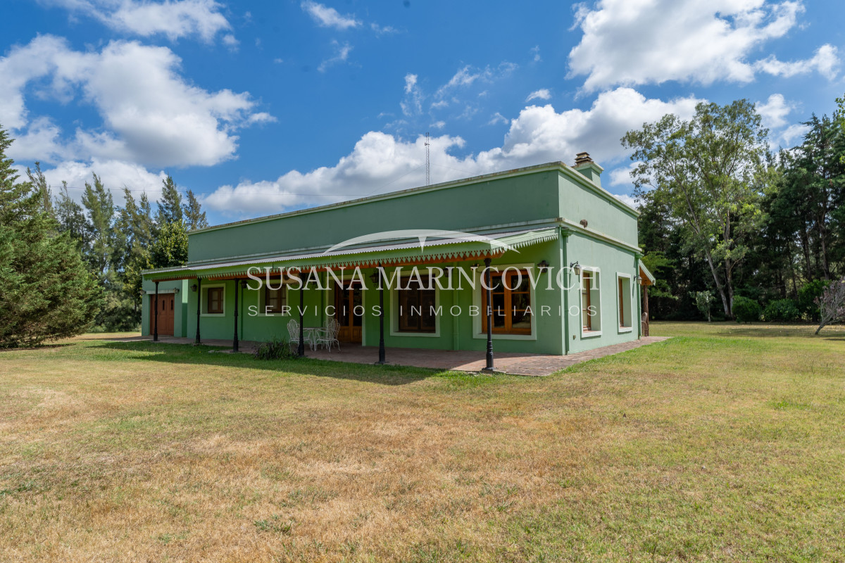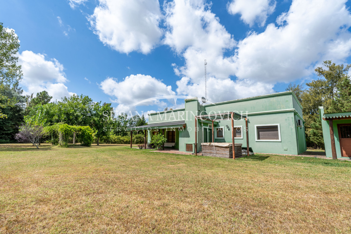 La casa principal cuenta con una superficie cubierta de 150 m² y se compone de living comedor, tres habitaciones, una de ellas en suite, y un baño completo para visitas. La vivienda dispone de losa radiante en todos los ambientes, lo que permite una climatización uniforme.