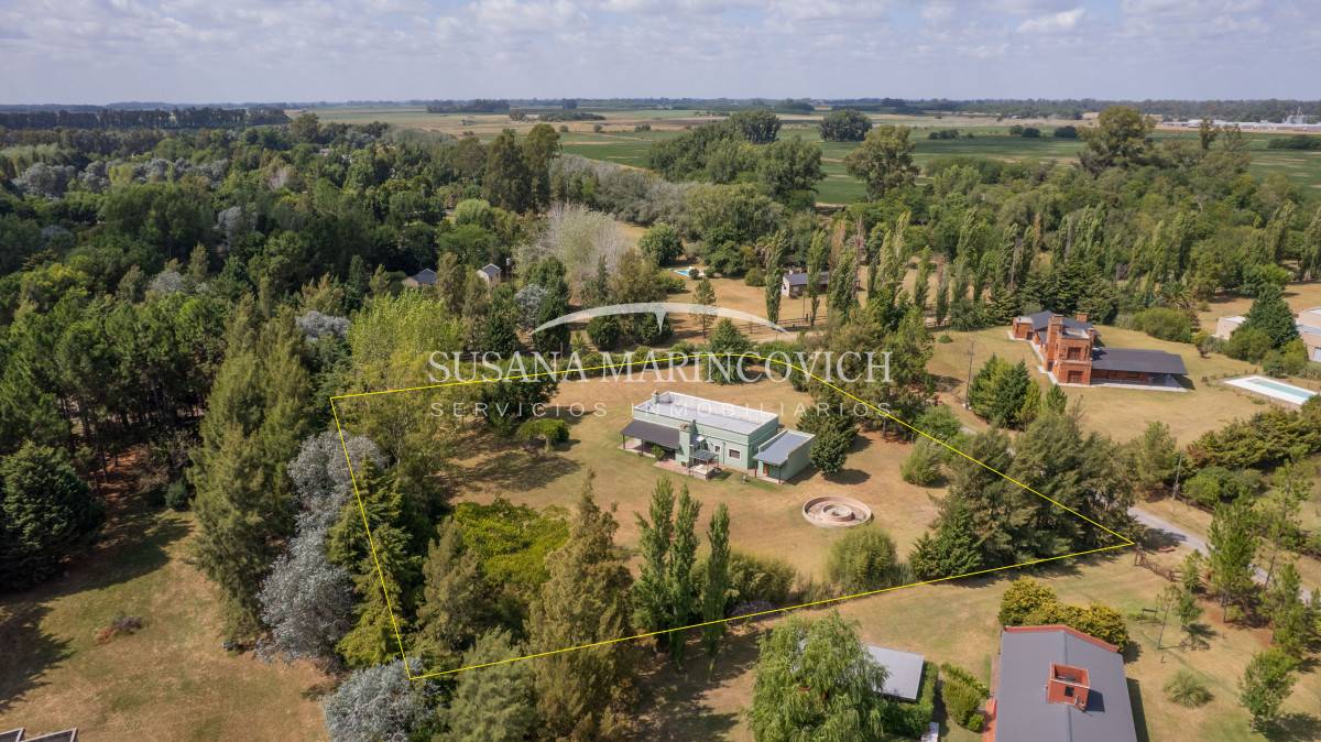 Propiedad ubicada en el barrio cerrado El Chamical, en San Andrés de Giles, desarrollada sobre un terreno de 5.000 m², con perímetros arbolados y árboles frutales en el fondo del lote.