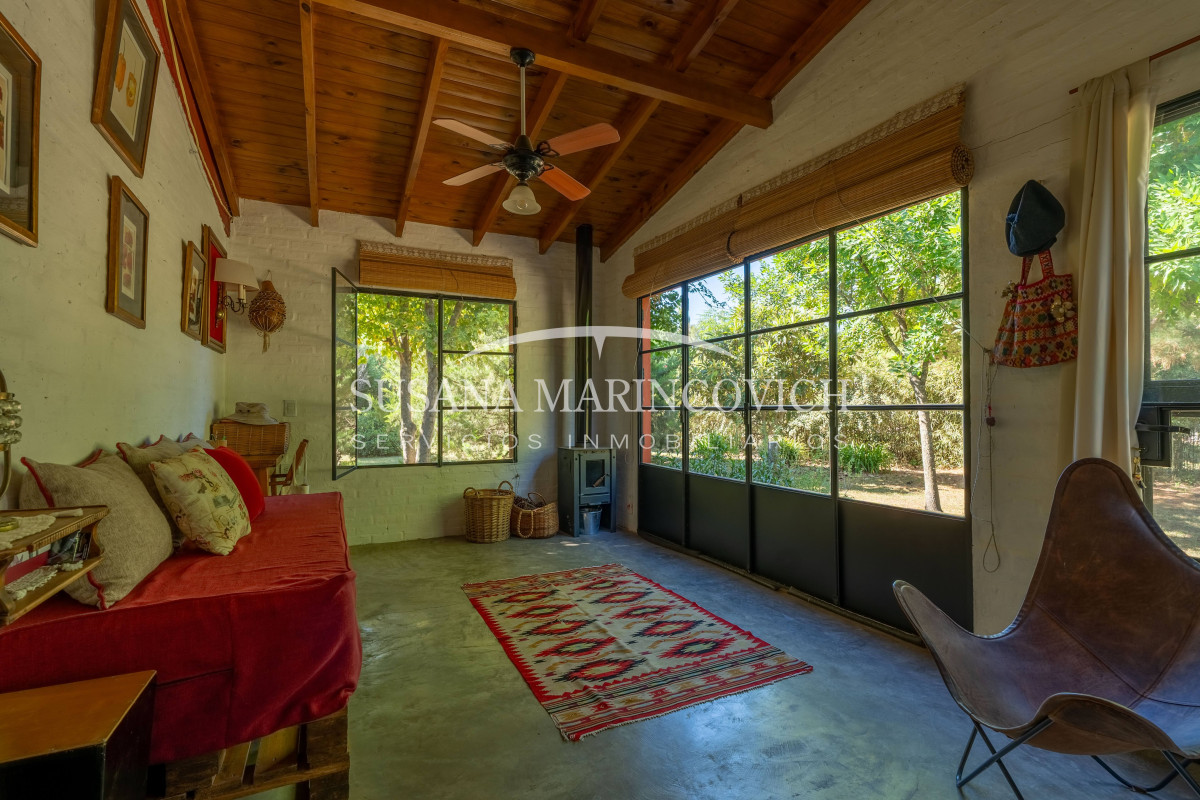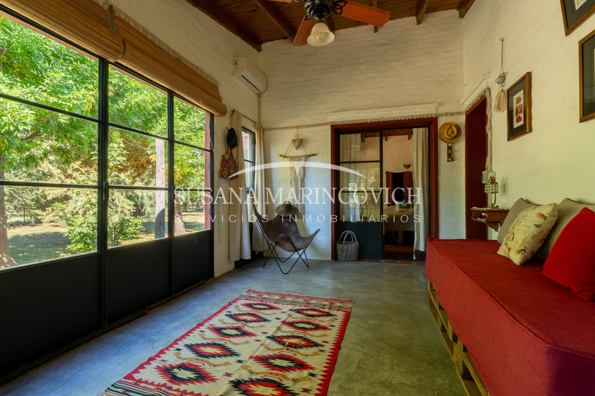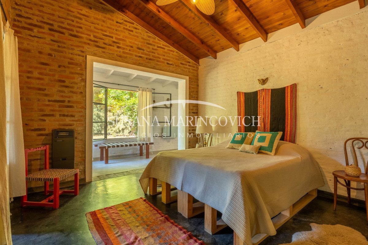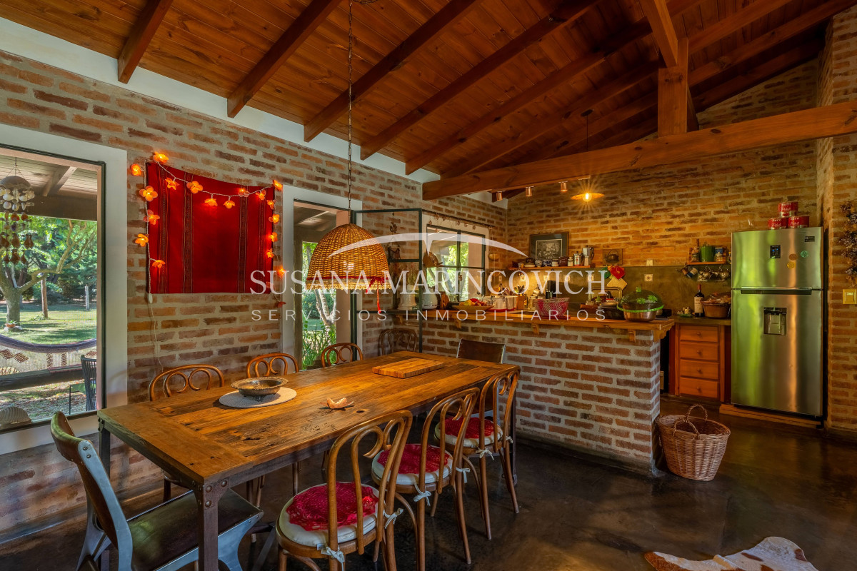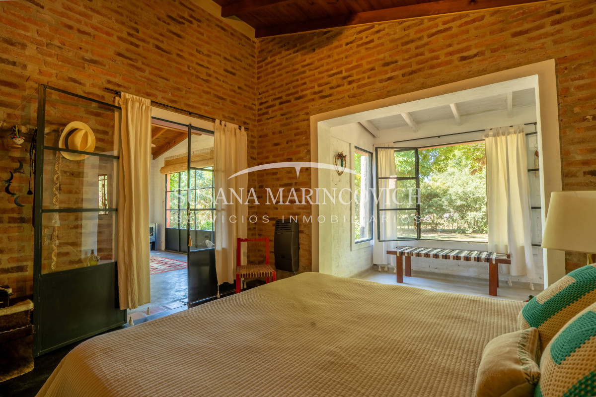El interior de la casa se organiza a partir de un living-cocina-comedor integrado, con hogar a leña y equipo de aire frío-calor. La cocina y la heladera se incluyen en la venta. La casa cuenta con tres dormitorios, dos de ellos con baño en suite, y la posibilidad de incorporar un tercer dormitorio en el espacio que hoy funciona como jardín de invierno.
