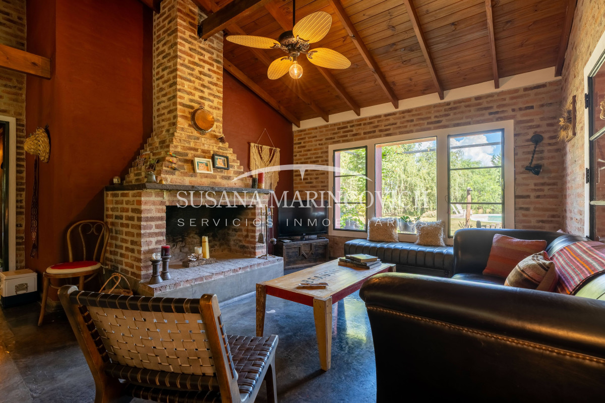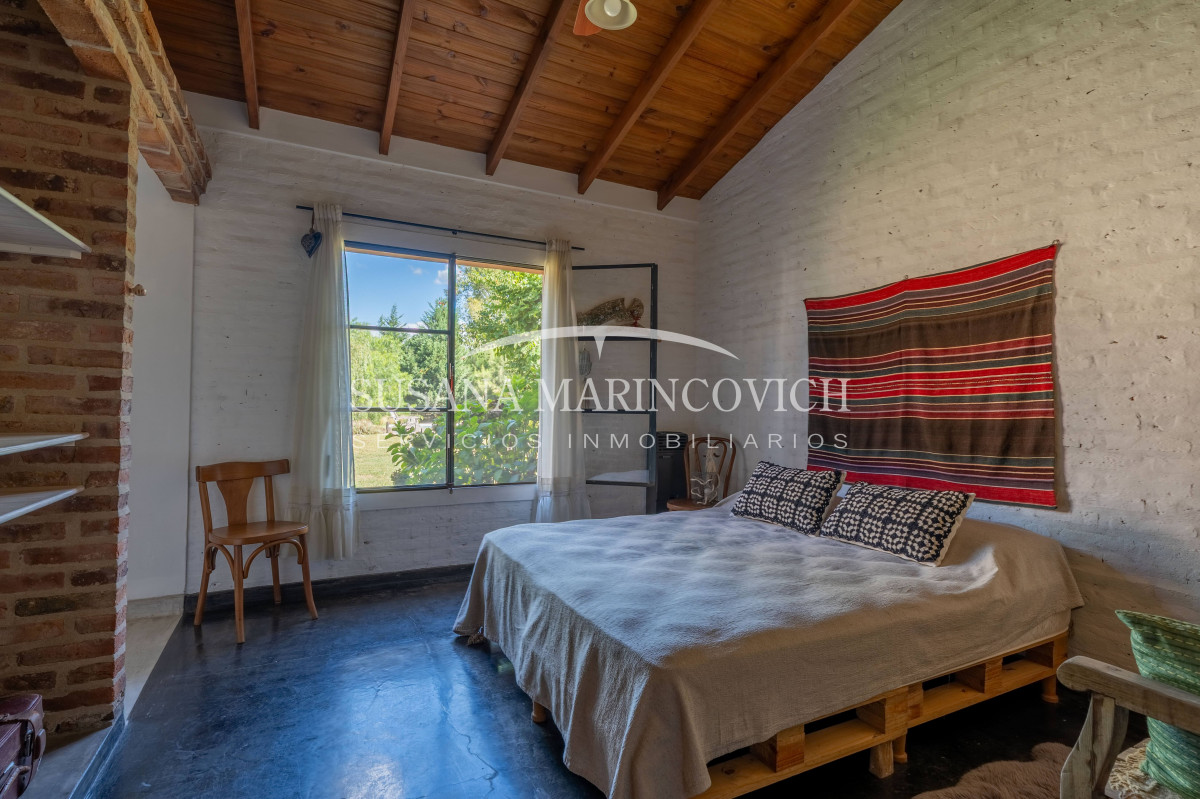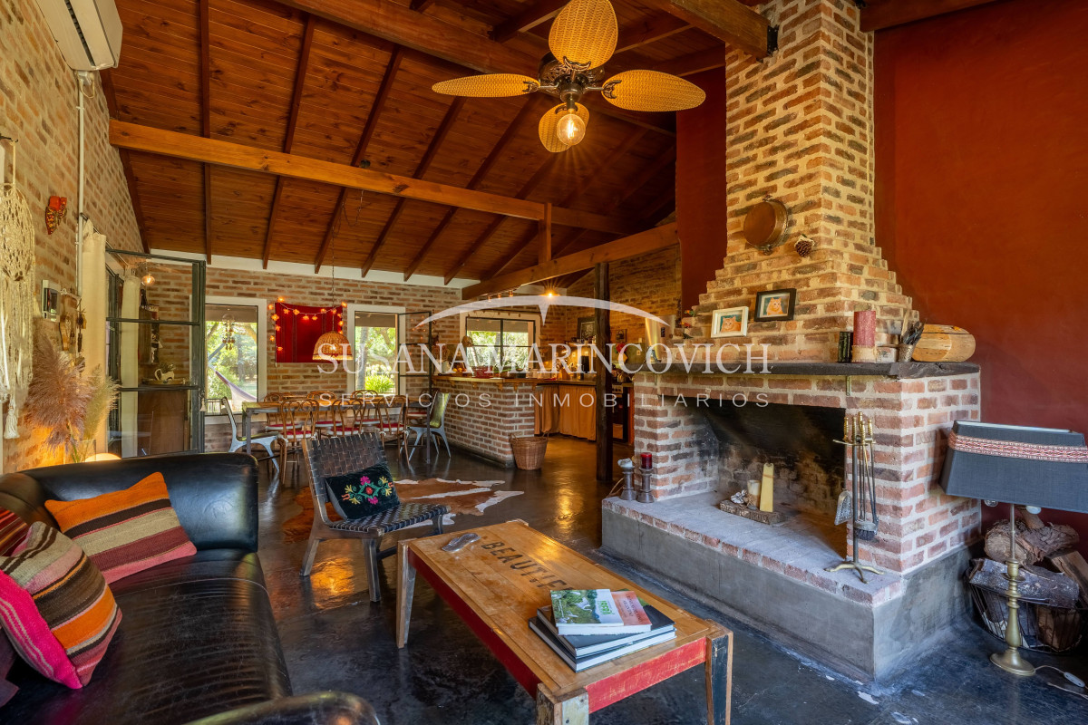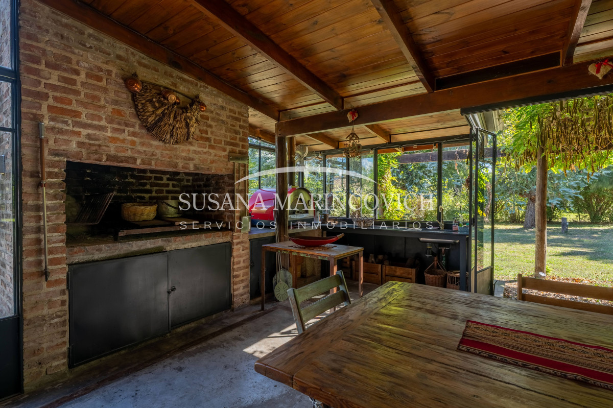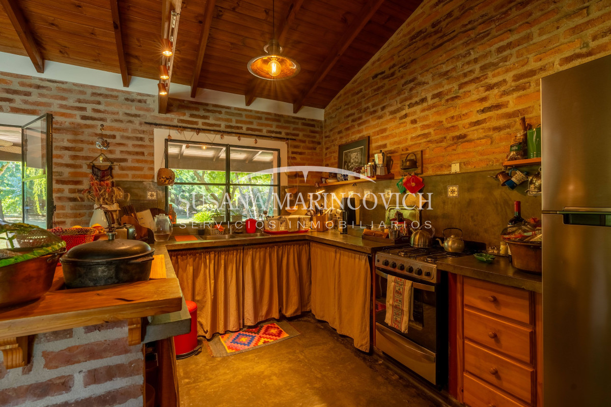 El interior de la casa se organiza a partir de un living-cocina-comedor integrado, con hogar a leña y equipo de aire frío-calor. La cocina y la heladera se incluyen en la venta. La casa cuenta con tres dormitorios, dos de ellos con baño en suite, y la posibilidad de incorporar un tercer dormitorio en el espacio que hoy funciona como jardín de invierno.
