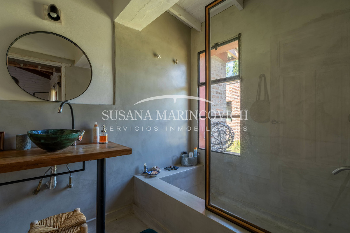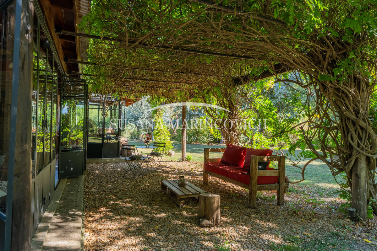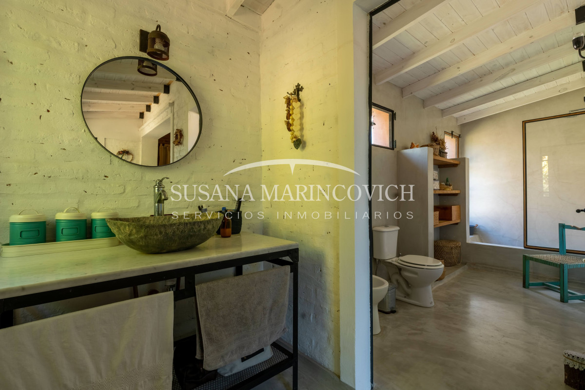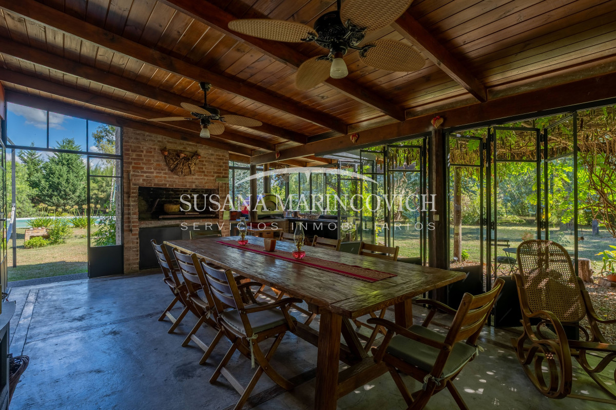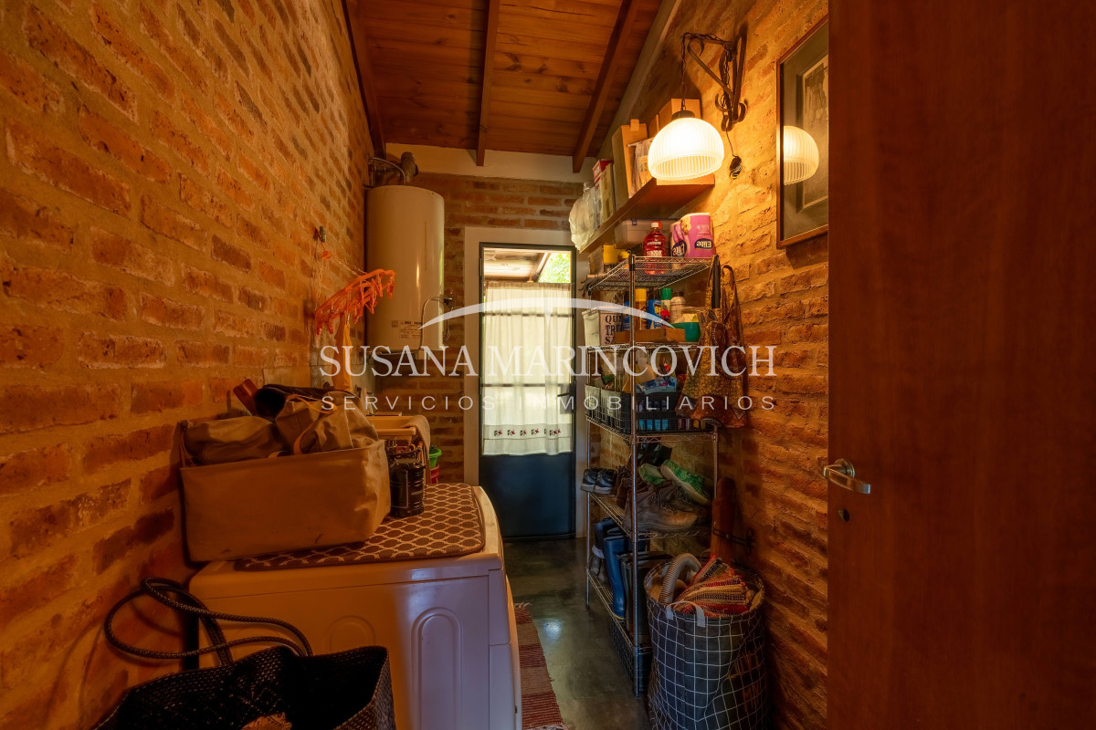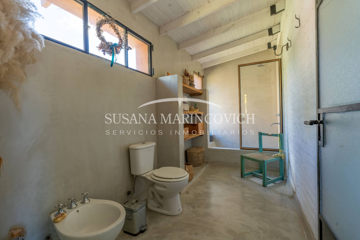 El interior de la casa se organiza a partir de un living-cocina-comedor integrado, con hogar a leña y equipo de aire frío-calor. La cocina y la heladera se incluyen en la venta. La casa cuenta con tres dormitorios, dos de ellos con baño en suite, y la posibilidad de incorporar un tercer dormitorio en el espacio que hoy funciona como jardín de invierno.
