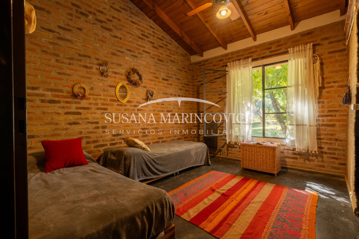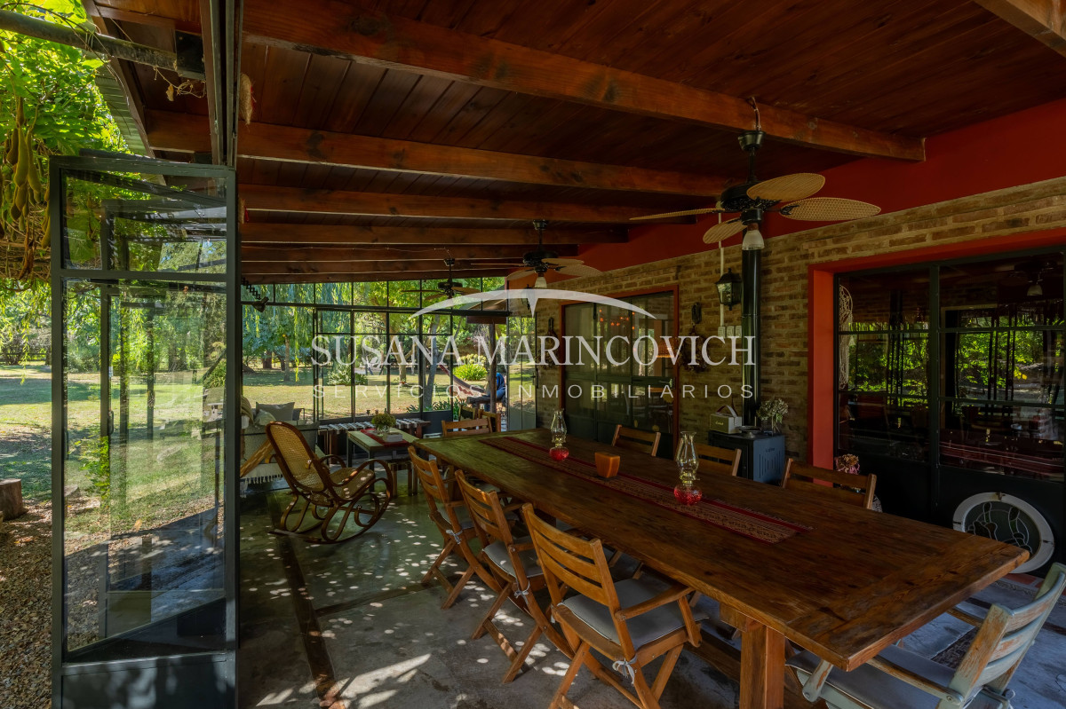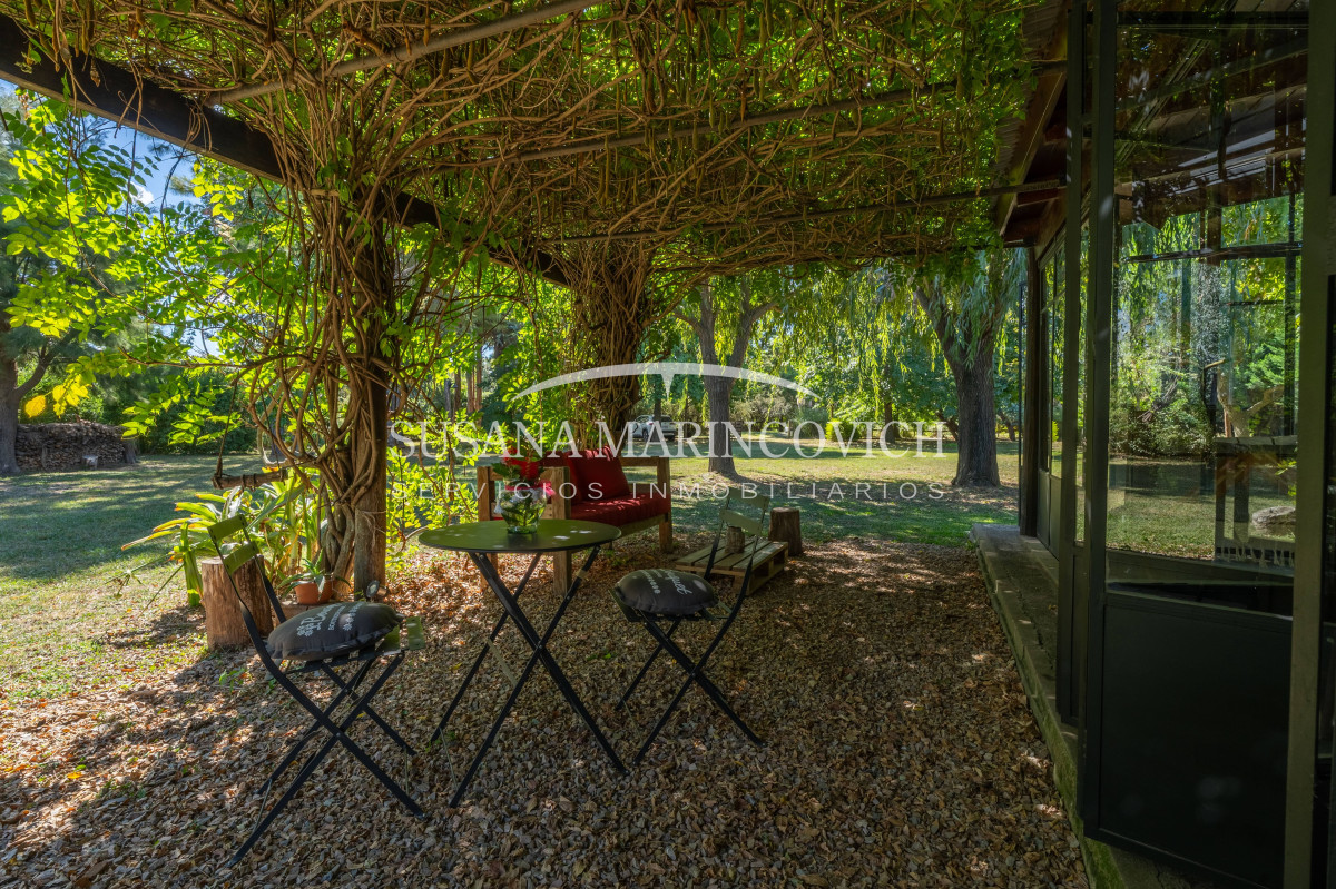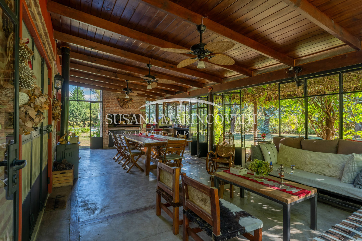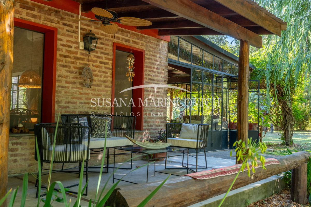 El interior de la casa se organiza a partir de un living-cocina-comedor integrado, con hogar a leña y equipo de aire frío-calor. La cocina y la heladera se incluyen en la venta. La casa cuenta con tres dormitorios, dos de ellos con baño en suite, y la posibilidad de incorporar un tercer dormitorio en el espacio que hoy funciona como jardín de invierno.
