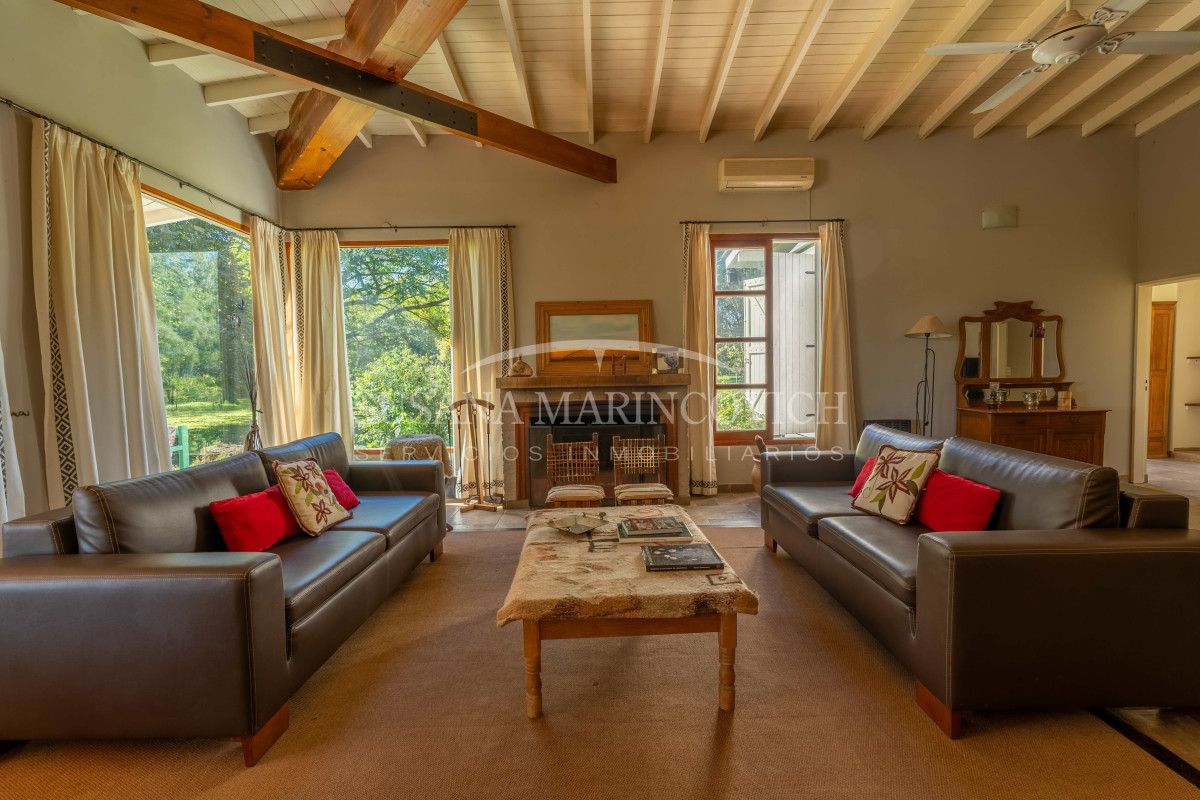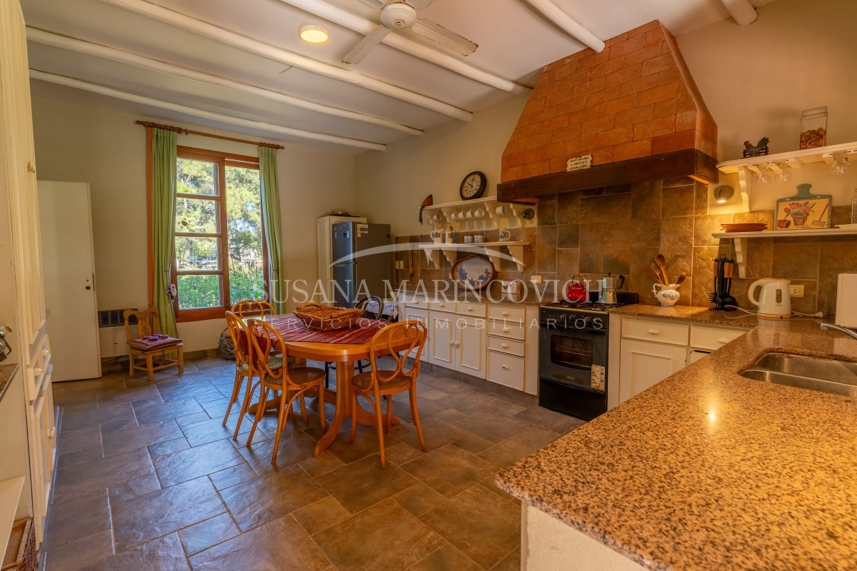 La propiedad cuenta con 252 m² cubiertos y 90 m² semicubiertos sobre un lote de 5.012 m². La vivienda distribuye su planta en hall de entrada, living-comedor con hogar a leña, cocina, escritorio, tres dormitorios —uno de ellos en suite— y un baño completo. La galería semicubierta en L incluye parrilla y espacio para dos vehículos.