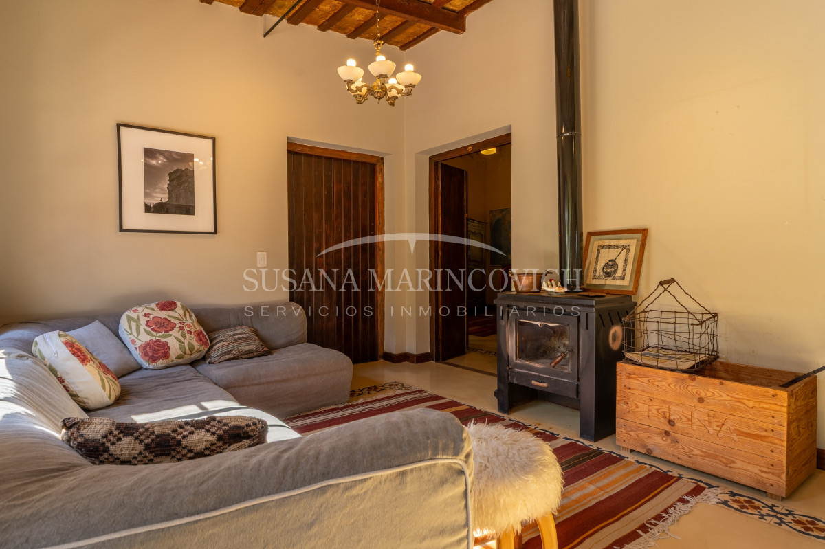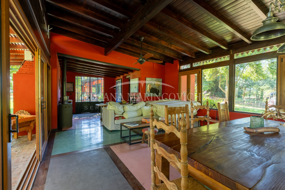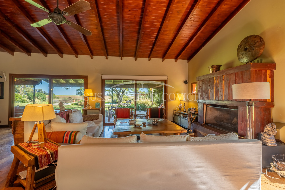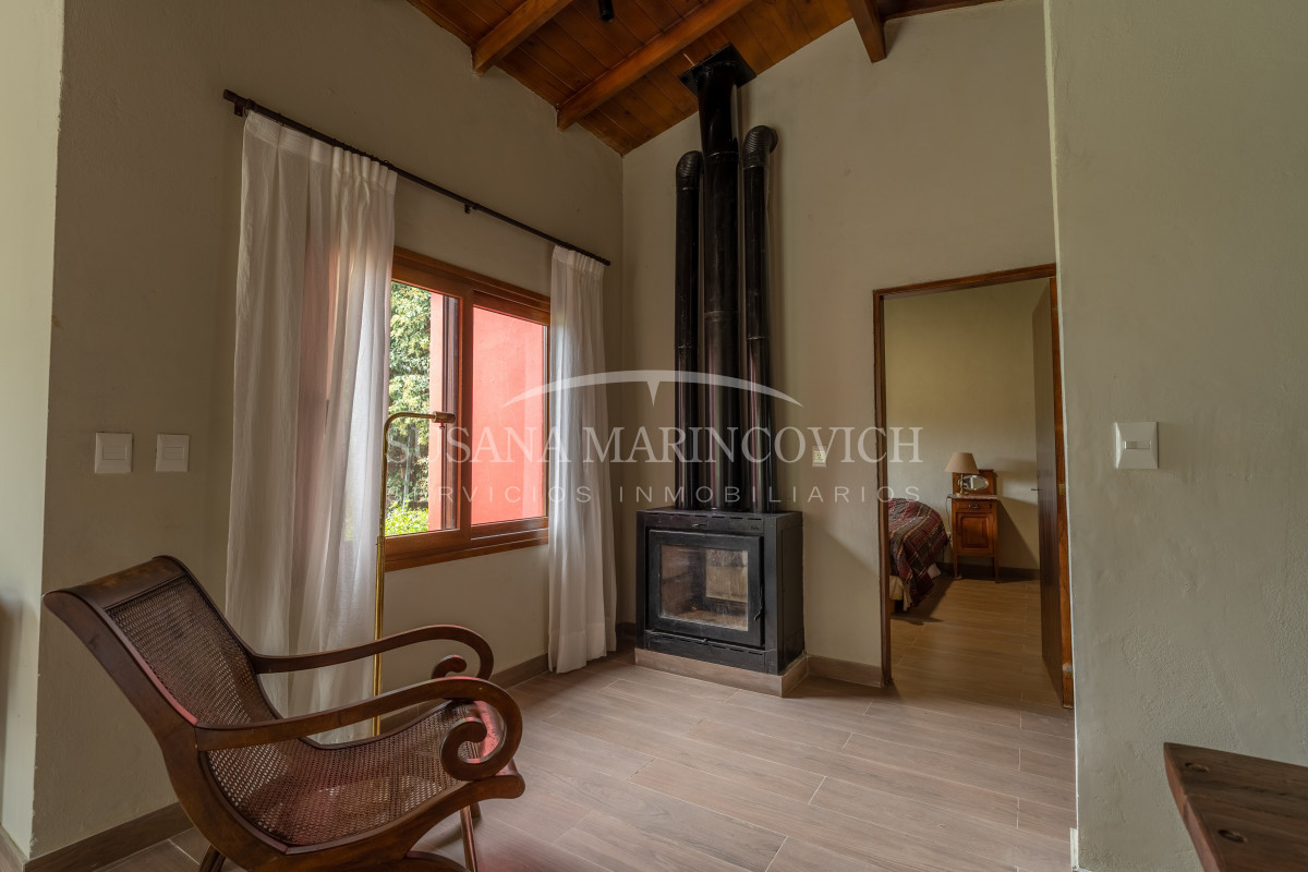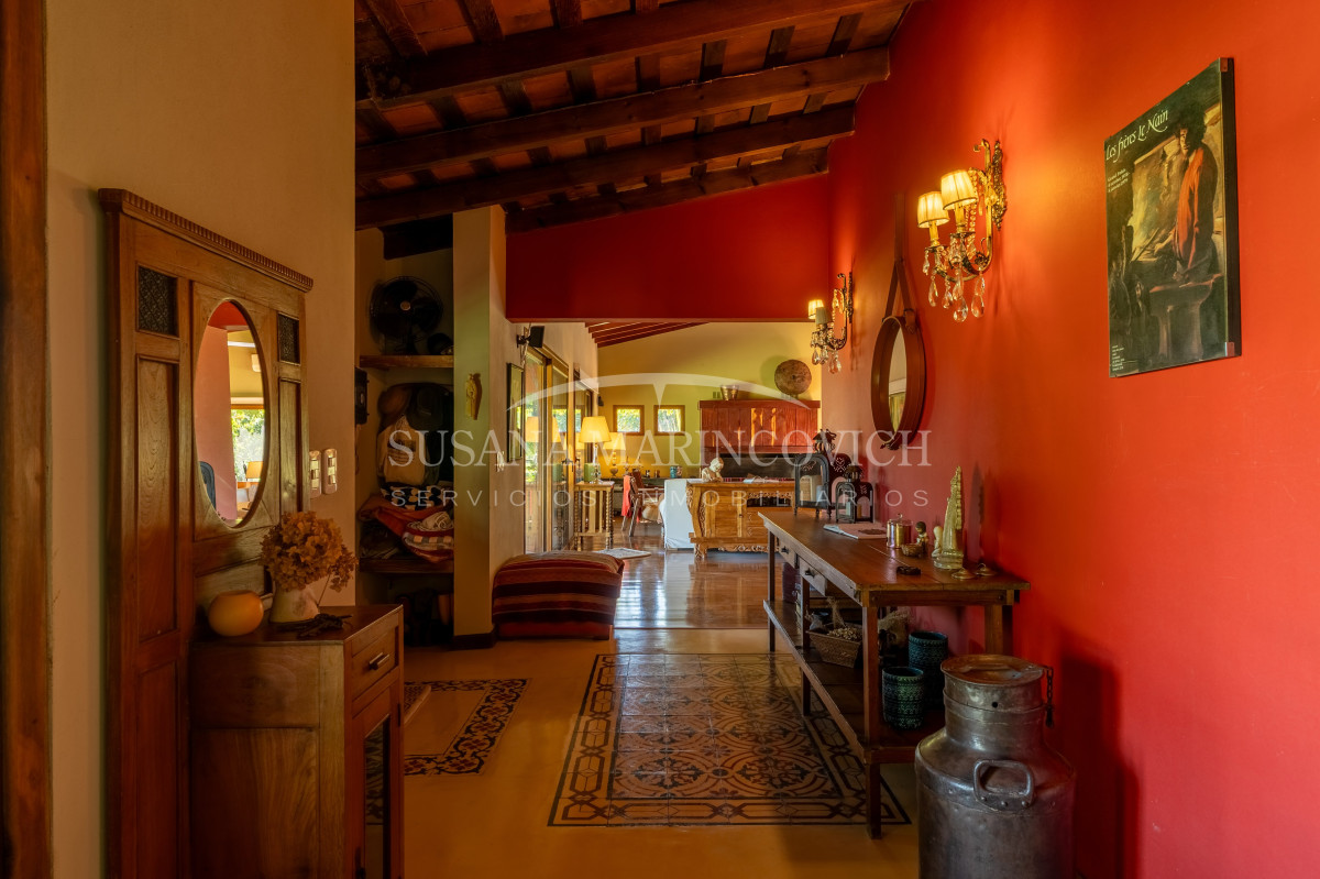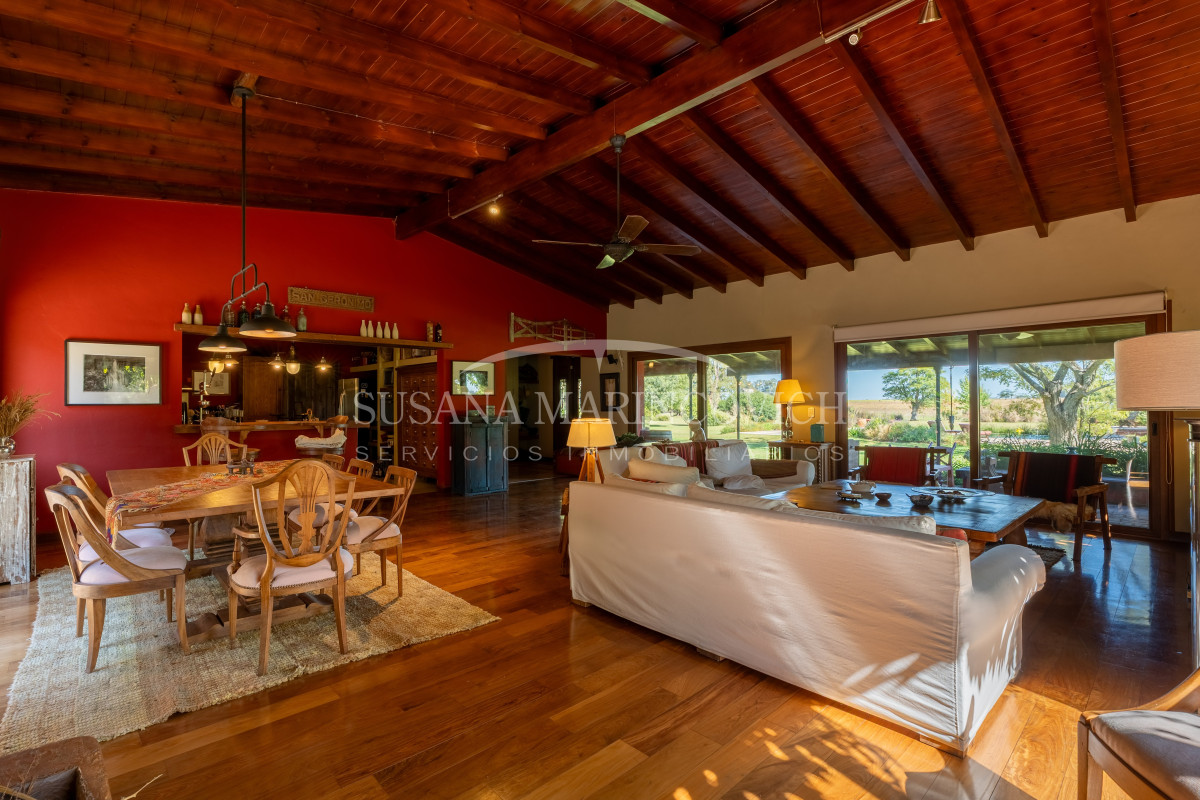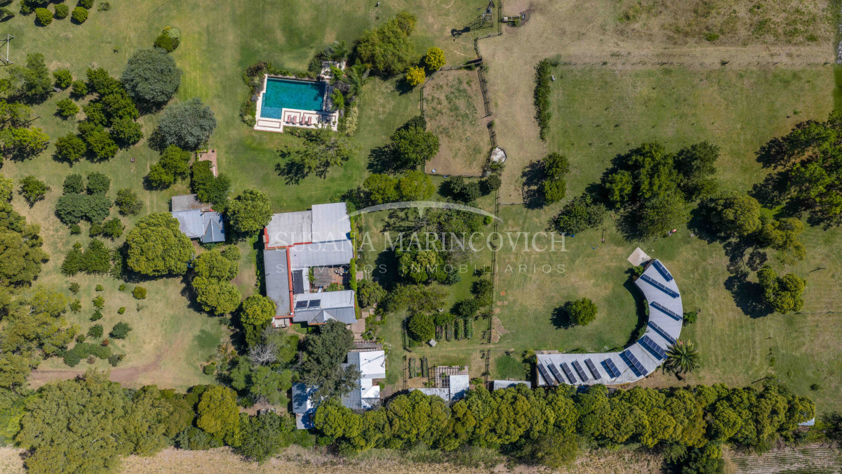 La casa principal tiene 340 m² distribuidos en cuatro suites con baño privado, cuarto principal de 40 m², escritorio, family room, living comedor con cocina integrada y patio interno con fuente. La calefacción combina piso radiante con energía solar, salamandras, chimeneas y aire frío/calor en todos los ambientes. Cocina a gas, fibra óptica hasta el campo, conexión satelital y sistema de videovigilancia con monitoreo 7x24. La construcción es parcialmente antigua y parcialmente renovada, con la mitad de la casa con una antigüedad de 10 años.