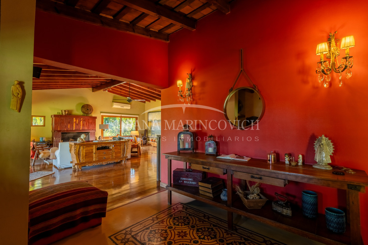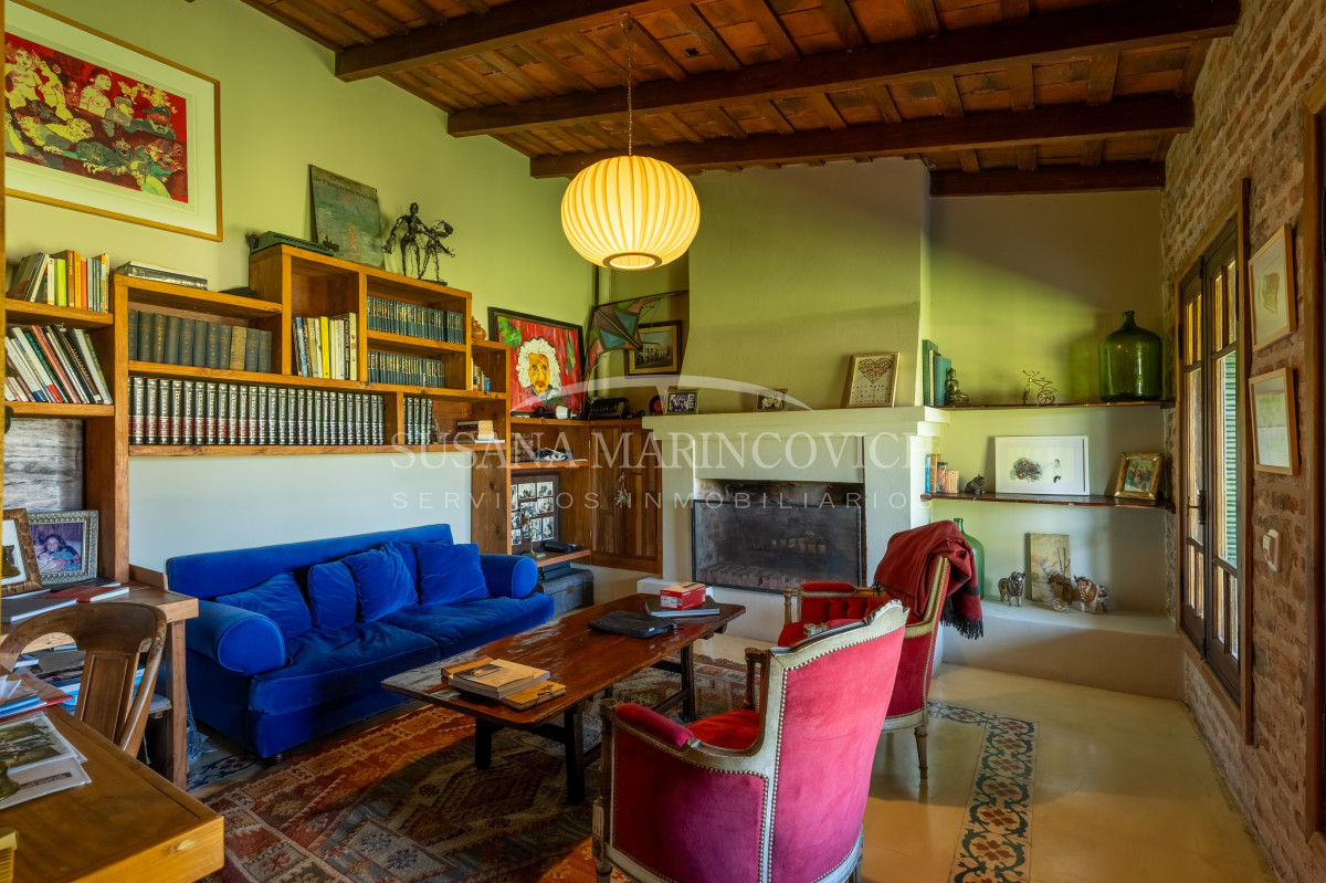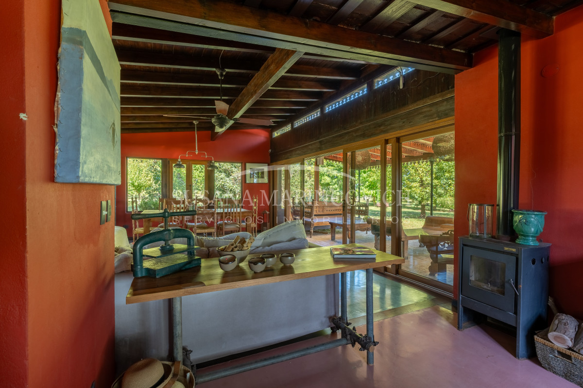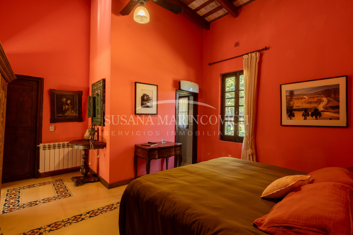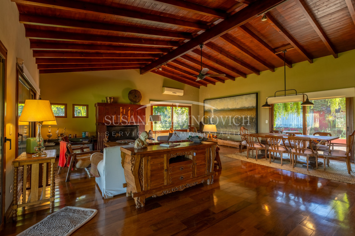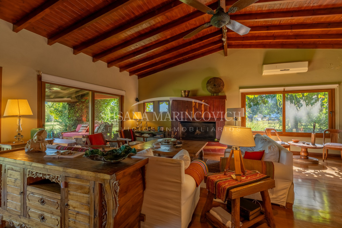 La casa principal tiene 340 m² distribuidos en cuatro suites con baño privado, cuarto principal de 40 m², escritorio, family room, living comedor con cocina integrada y patio interno con fuente. La calefacción combina piso radiante con energía solar, salamandras, chimeneas y aire frío/calor en todos los ambientes. Cocina a gas, fibra óptica hasta el campo, conexión satelital y sistema de videovigilancia con monitoreo 7x24. La construcción es parcialmente antigua y parcialmente renovada, con la mitad de la casa con una antigüedad de 10 años.