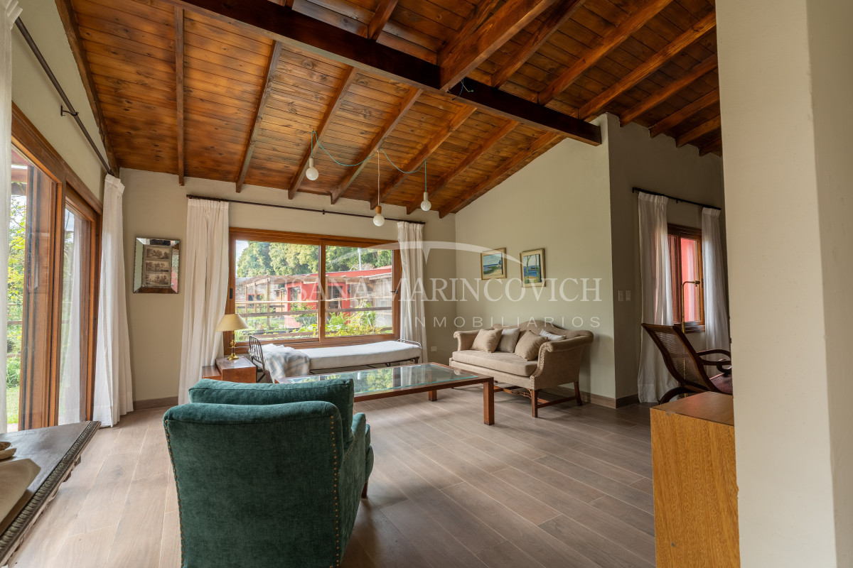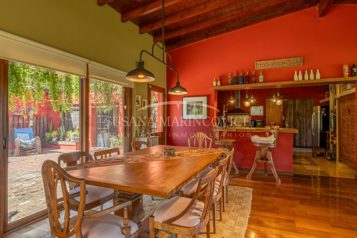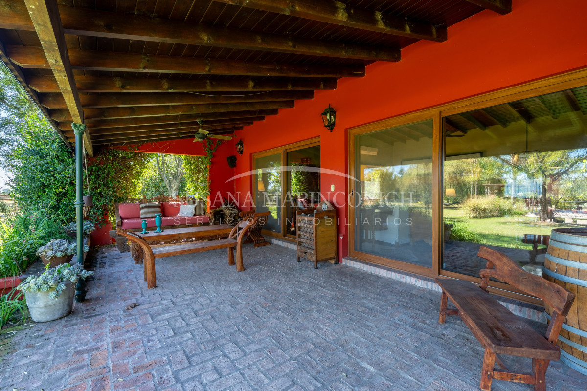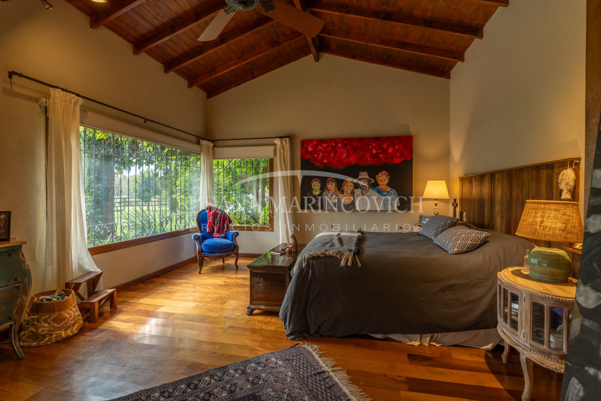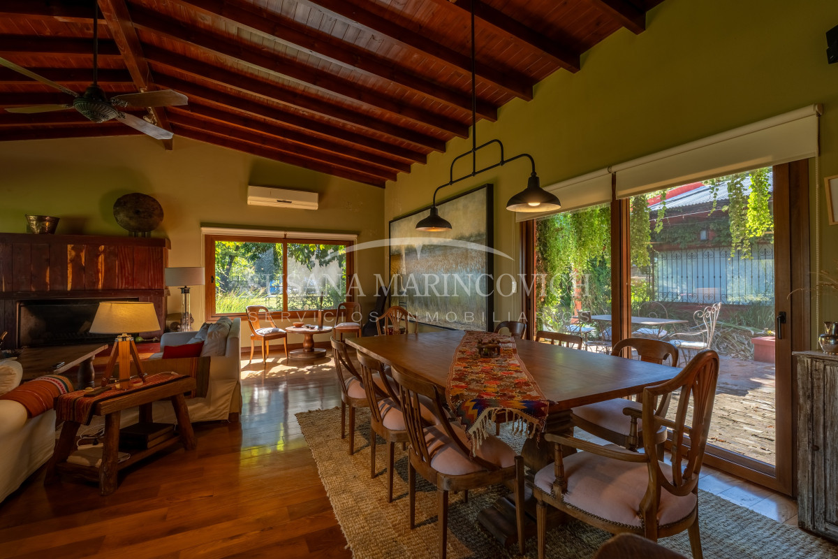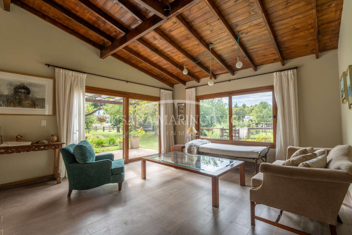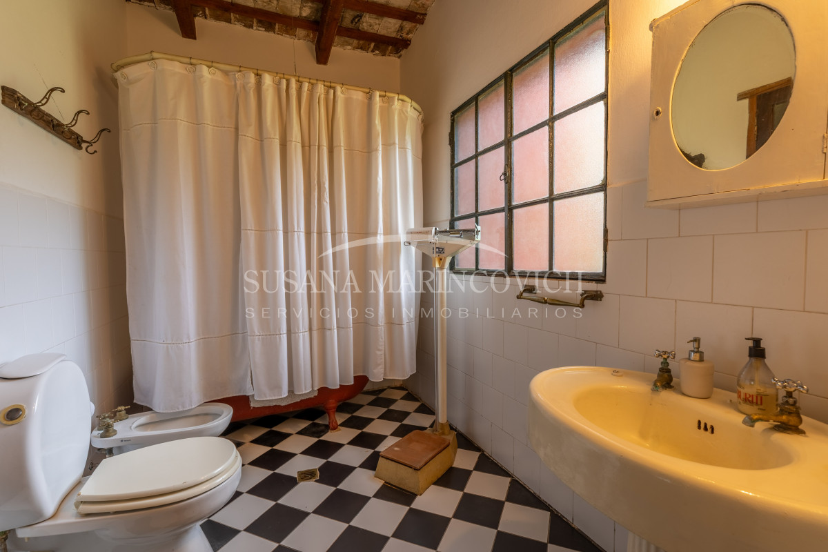 La casa principal tiene 340 m² distribuidos en cuatro suites con baño privado, cuarto principal de 40 m², escritorio, family room, living comedor con cocina integrada y patio interno con fuente. La calefacción combina piso radiante con energía solar, salamandras, chimeneas y aire frío/calor en todos los ambientes. Cocina a gas, fibra óptica hasta el campo, conexión satelital y sistema de videovigilancia con monitoreo 7x24. La construcción es parcialmente antigua y parcialmente renovada, con la mitad de la casa con una antigüedad de 10 años.