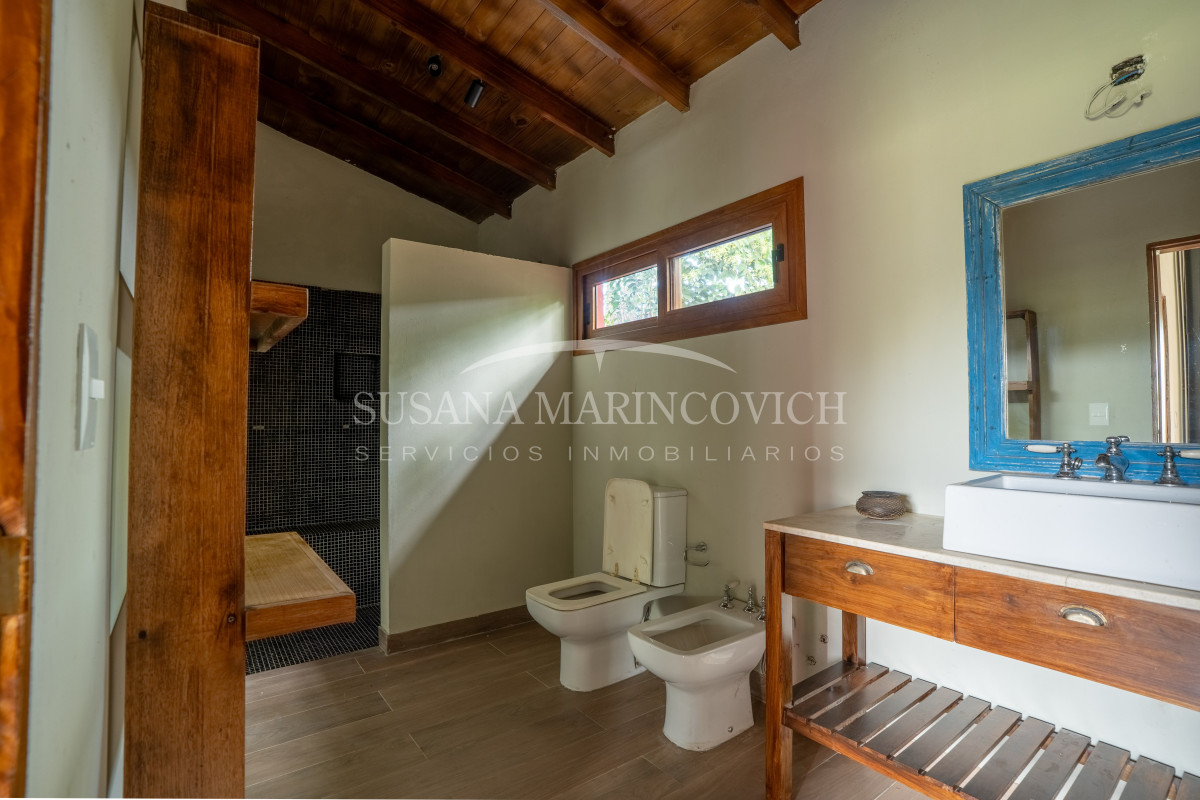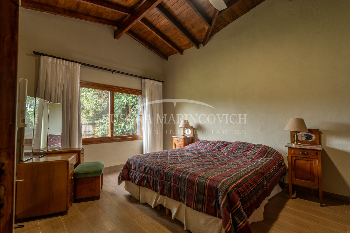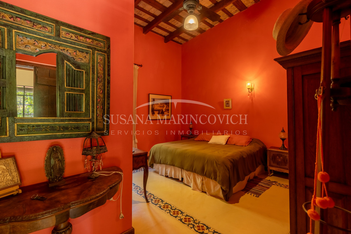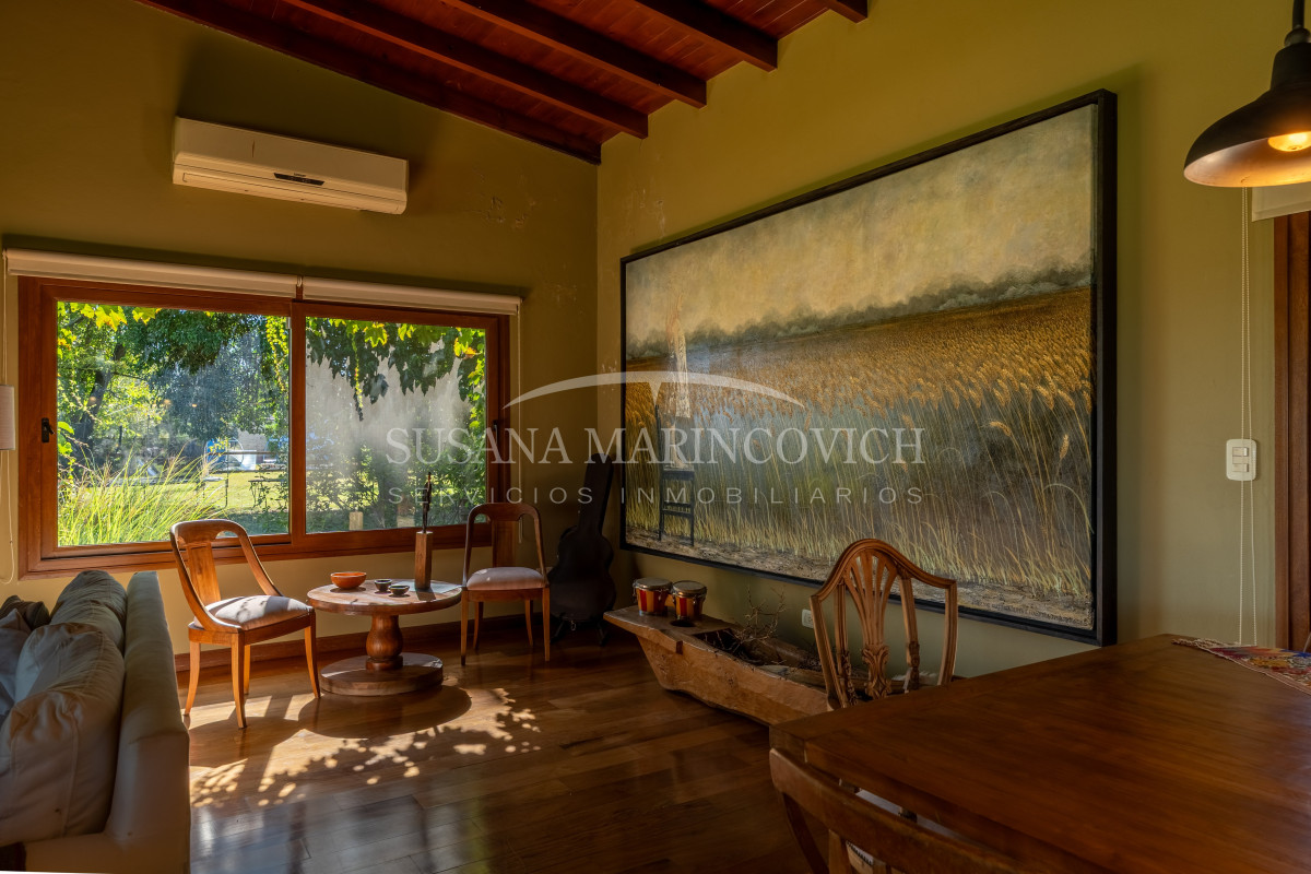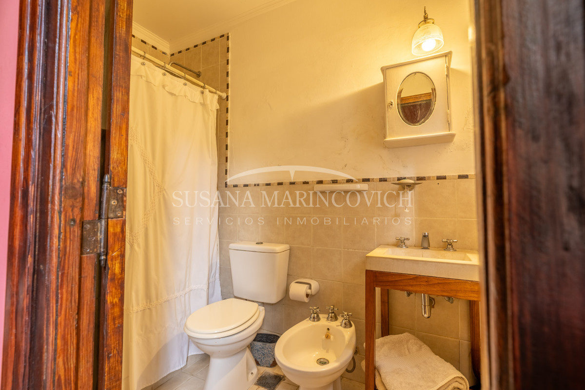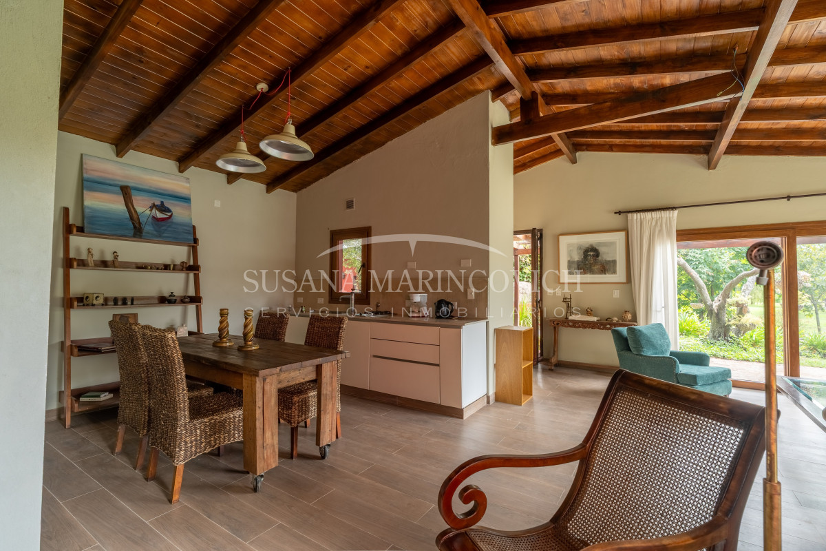 La casa principal tiene 340 m² distribuidos en cuatro suites con baño privado, cuarto principal de 40 m², escritorio, family room, living comedor con cocina integrada y patio interno con fuente. La calefacción combina piso radiante con energía solar, salamandras, chimeneas y aire frío/calor en todos los ambientes. Cocina a gas, fibra óptica hasta el campo, conexión satelital y sistema de videovigilancia con monitoreo 7x24. La construcción es parcialmente antigua y parcialmente renovada, con la mitad de la casa con una antigüedad de 10 años.