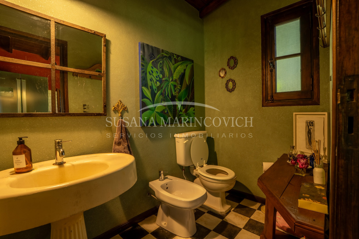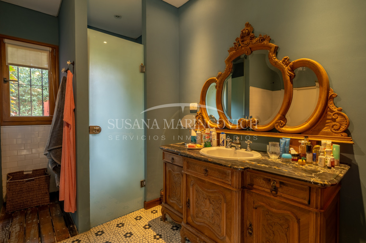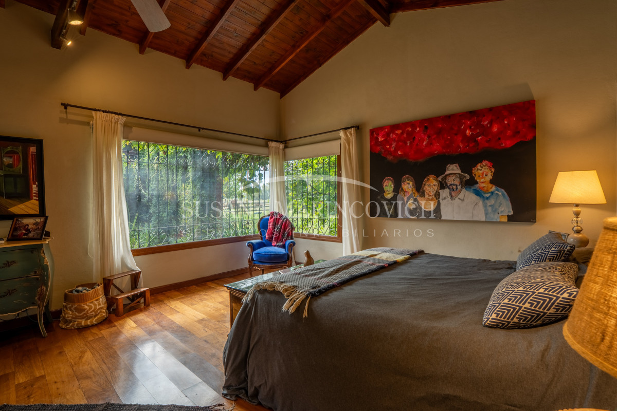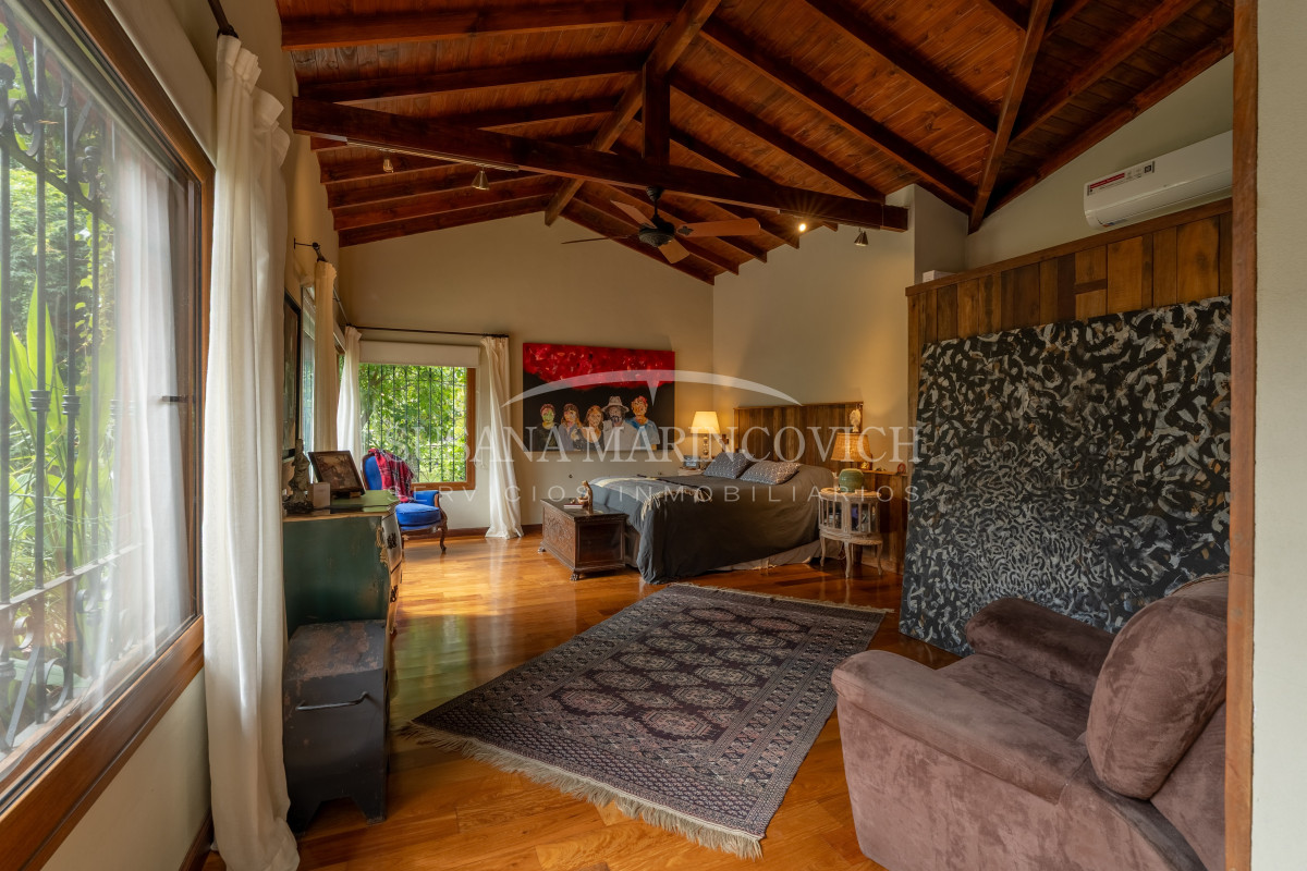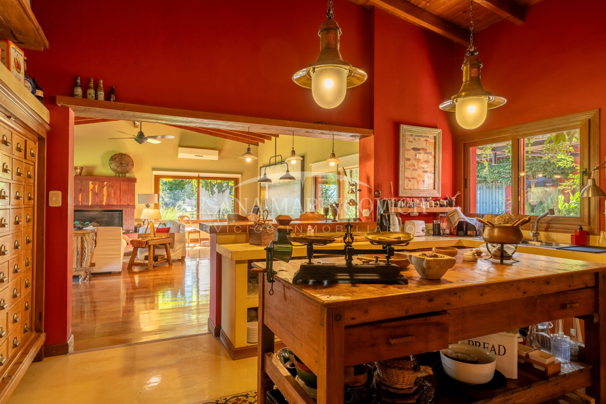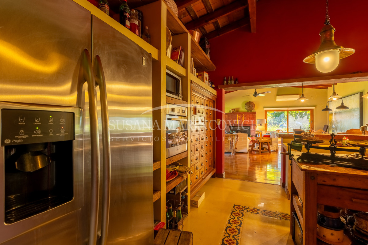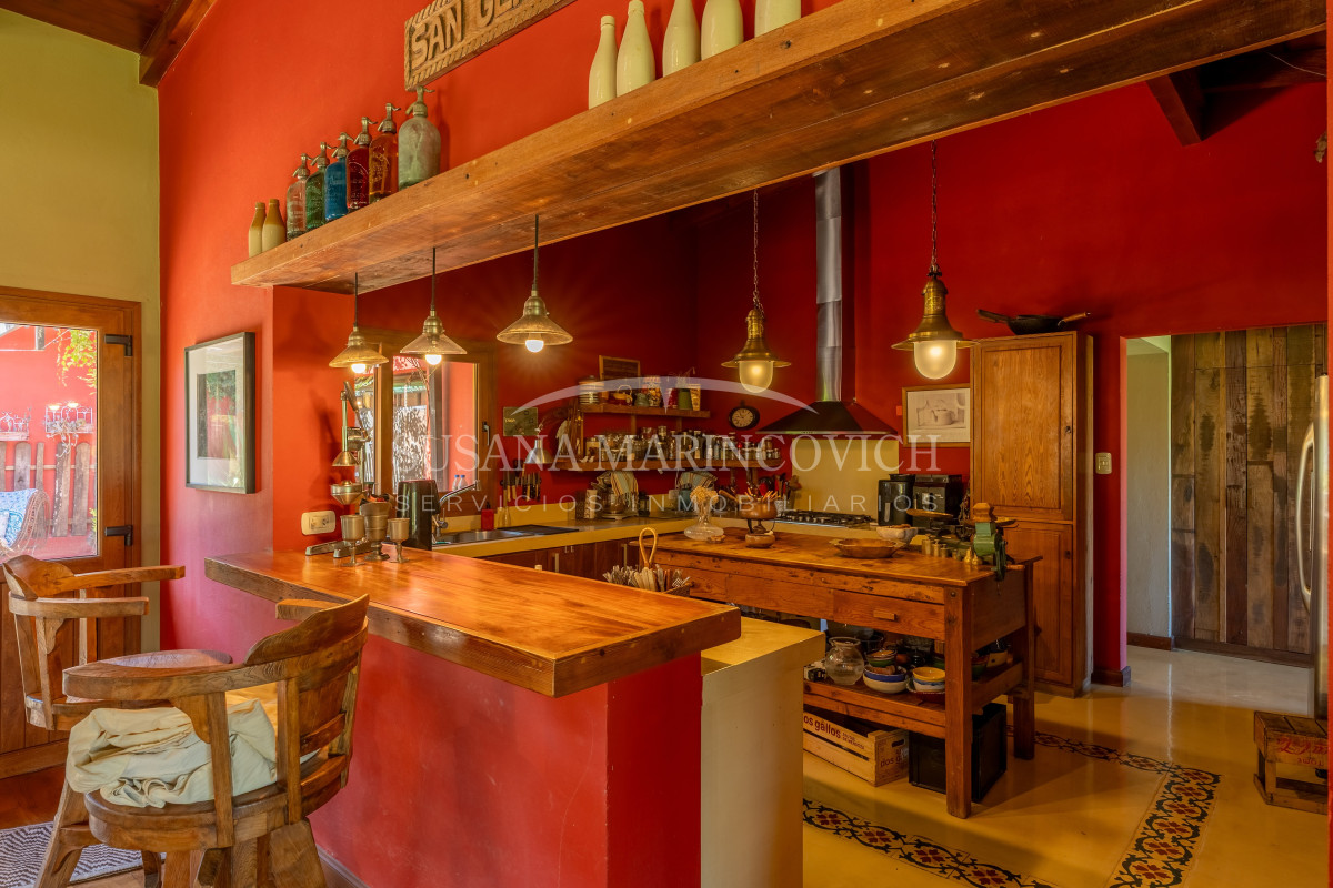 La casa principal tiene 340 m² distribuidos en cuatro suites con baño privado, cuarto principal de 40 m², escritorio, family room, living comedor con cocina integrada y patio interno con fuente. La calefacción combina piso radiante con energía solar, salamandras, chimeneas y aire frío/calor en todos los ambientes. Cocina a gas, fibra óptica hasta el campo, conexión satelital y sistema de videovigilancia con monitoreo 7x24. La construcción es parcialmente antigua y parcialmente renovada, con la mitad de la casa con una antigüedad de 10 años.