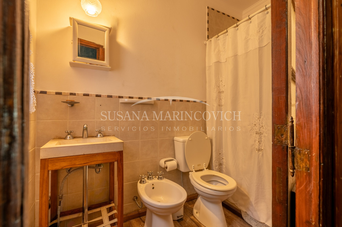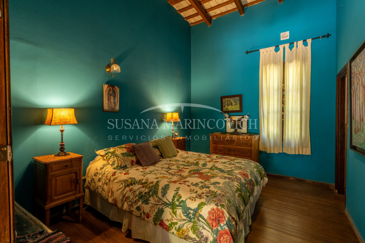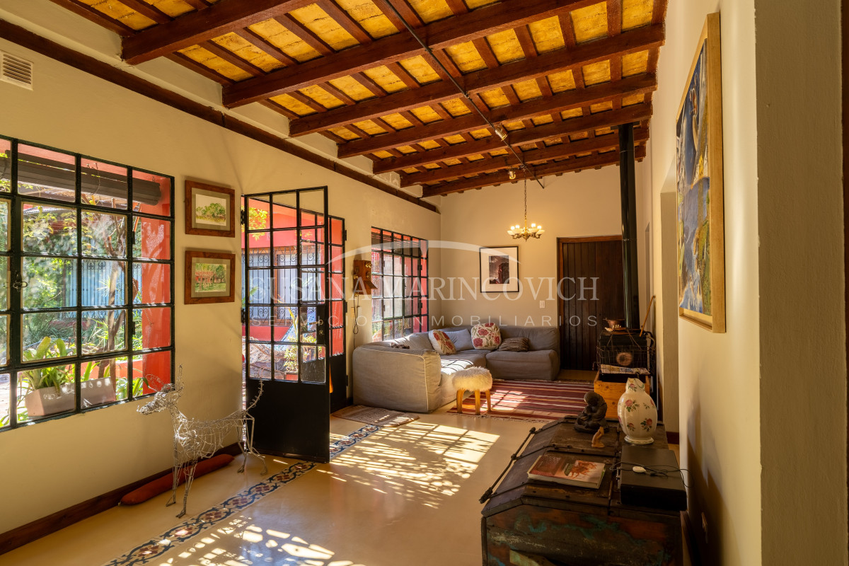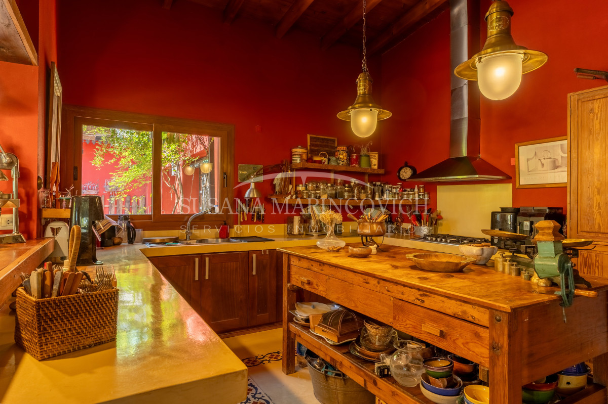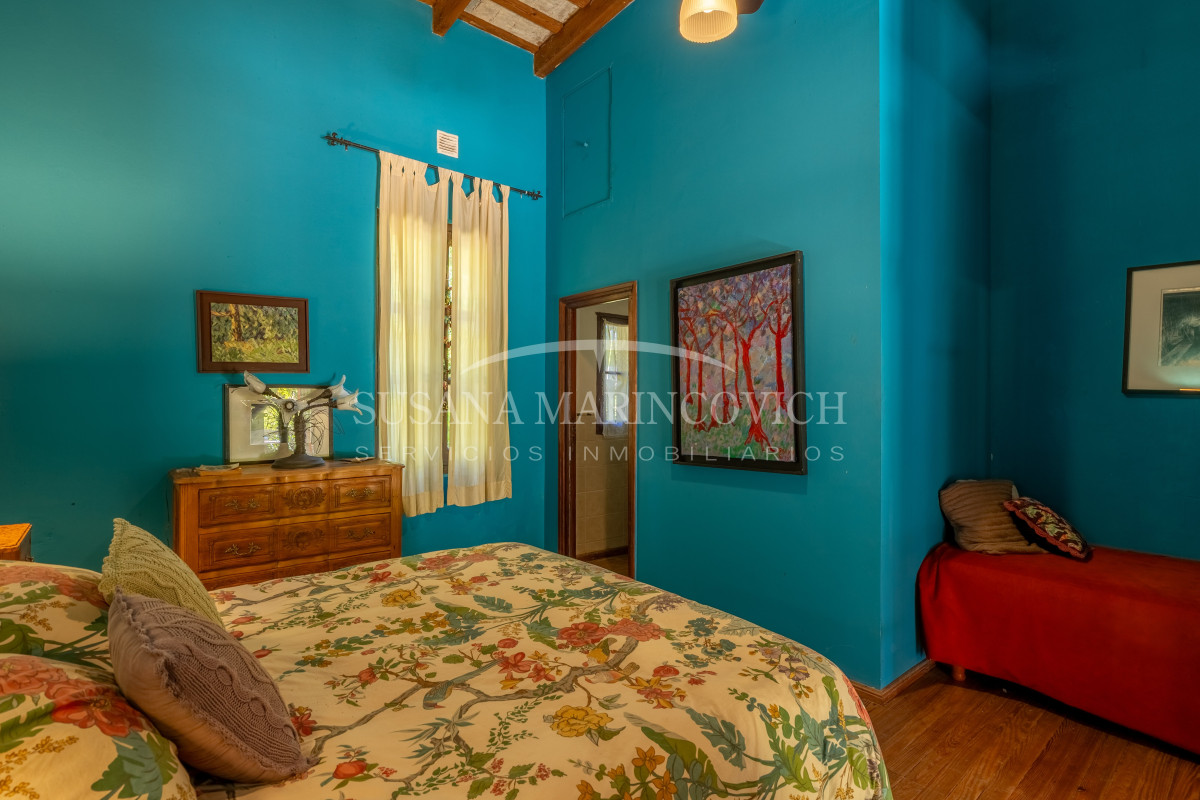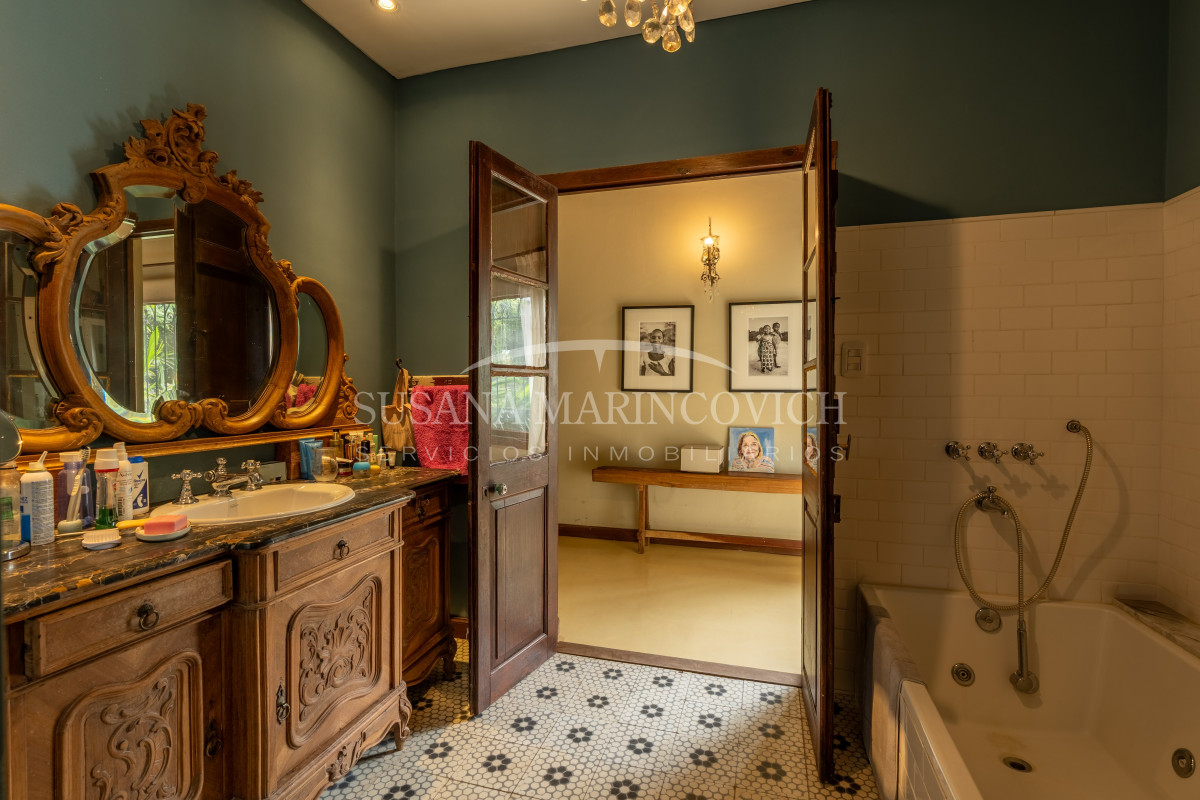 La casa principal tiene 340 m² distribuidos en cuatro suites con baño privado, cuarto principal de 40 m², escritorio, family room, living comedor con cocina integrada y patio interno con fuente. La calefacción combina piso radiante con energía solar, salamandras, chimeneas y aire frío/calor en todos los ambientes. Cocina a gas, fibra óptica hasta el campo, conexión satelital y sistema de videovigilancia con monitoreo 7x24. La construcción es parcialmente antigua y parcialmente renovada, con la mitad de la casa con una antigüedad de 10 años.