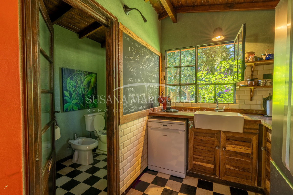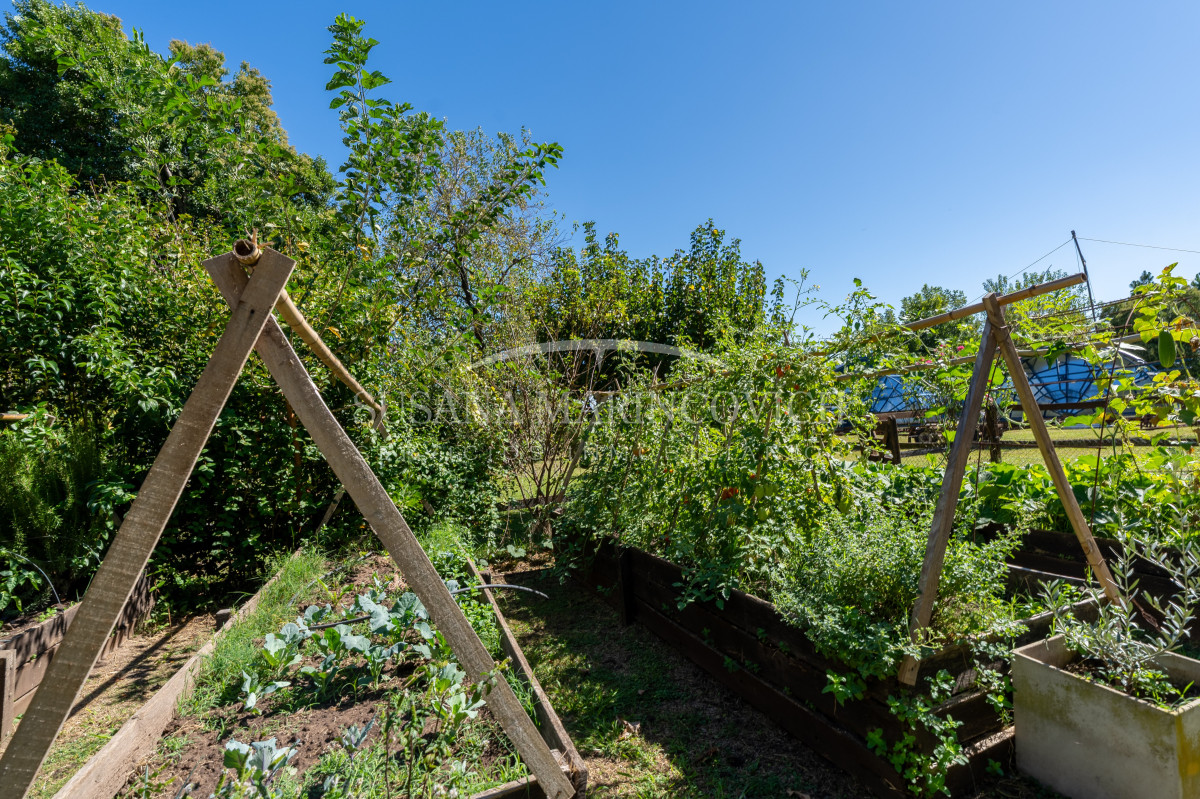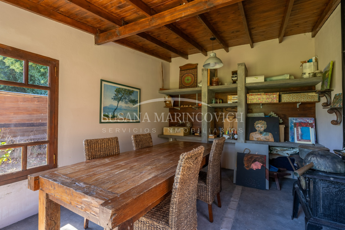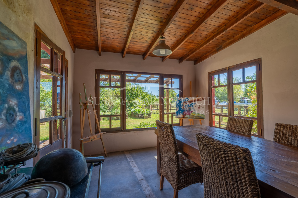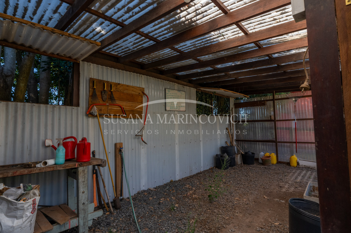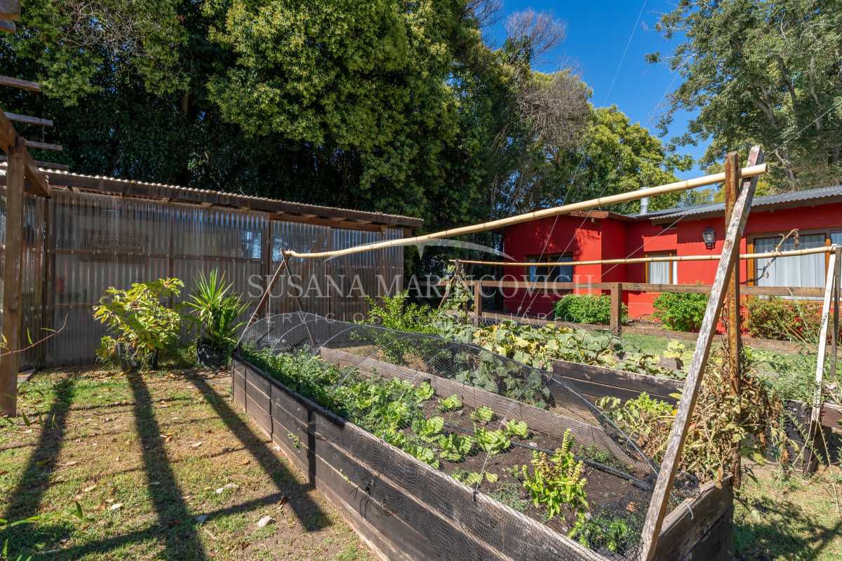 Dentro del área de huerta se encuentra la sala de taller de cerámica con horno propio y cobertura, ubicada junto al invernadero. La huerta cuenta con 10 cajoneras elevadas y sistema de riego.