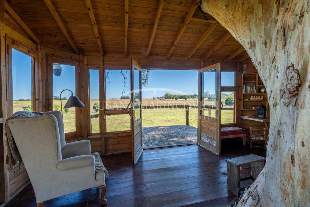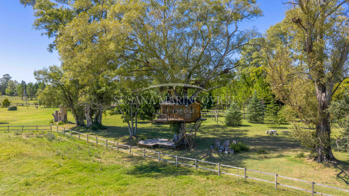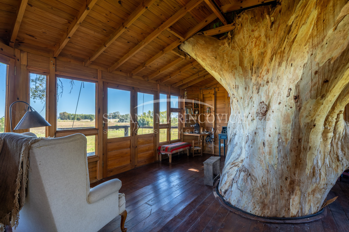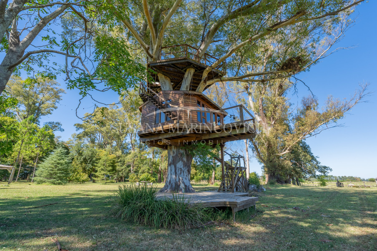 La casa del árbol, construida en un eucalipto centenario, tiene dos niveles con una habitación de casi 20 m² y una terraza a 11 metros de altura.
