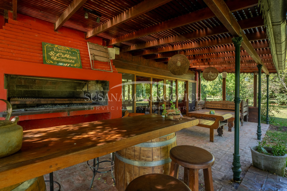 El quincho de 45 m² cuenta con baño, cocina equipada con heladera y freezer, salamandra y espacio para 12 personas. Se complementa con parrilla cubierta bajo glorieta con mesa exterior para 16 personas y un estar al aire libre con sillones y mesas.