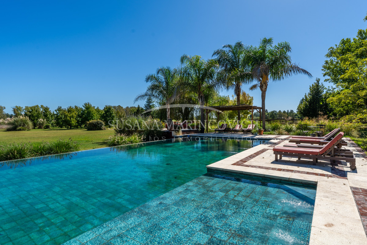 La pileta mide 11 x 5 metros con diseño de borde infinito y cuenta con zona de sombra para reposeras. El jardín tiene riego automático en su totalidad.