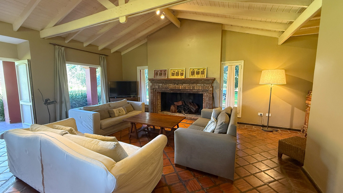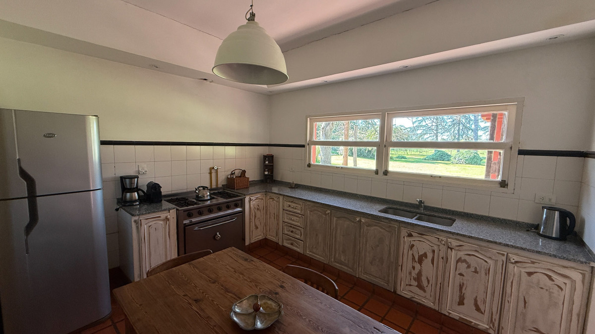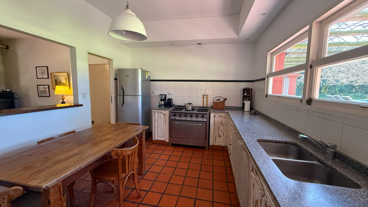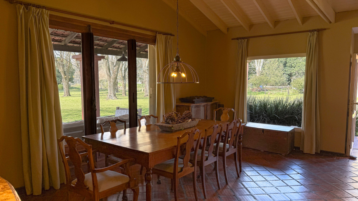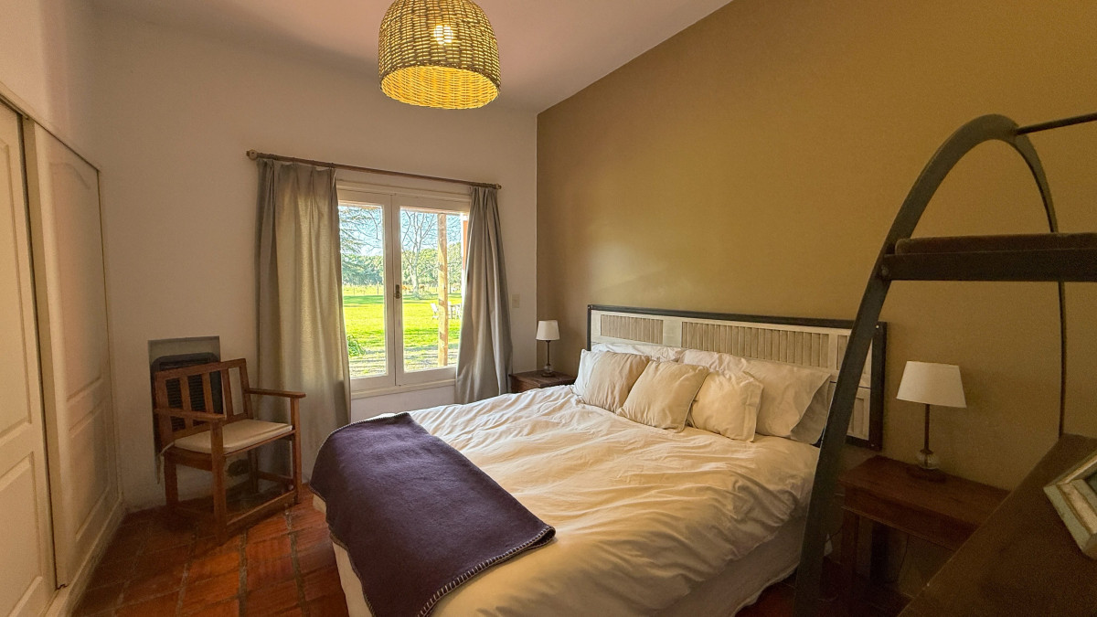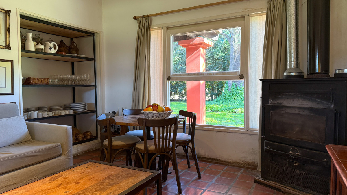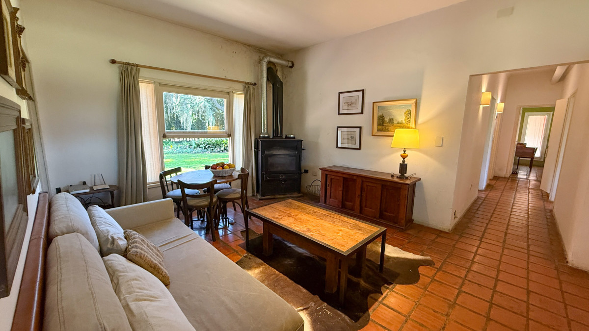 La casa principal ofrece amplio living-comedor con estufa hogar, cocina equipada, comedor diario con estufa Tromen y un sistema de calefacción a leña que distribuye el calor a las habitaciones. Dispone de cuatro dormitorios (uno en suite), dos baños completos, toilette y galería con vista al parque.