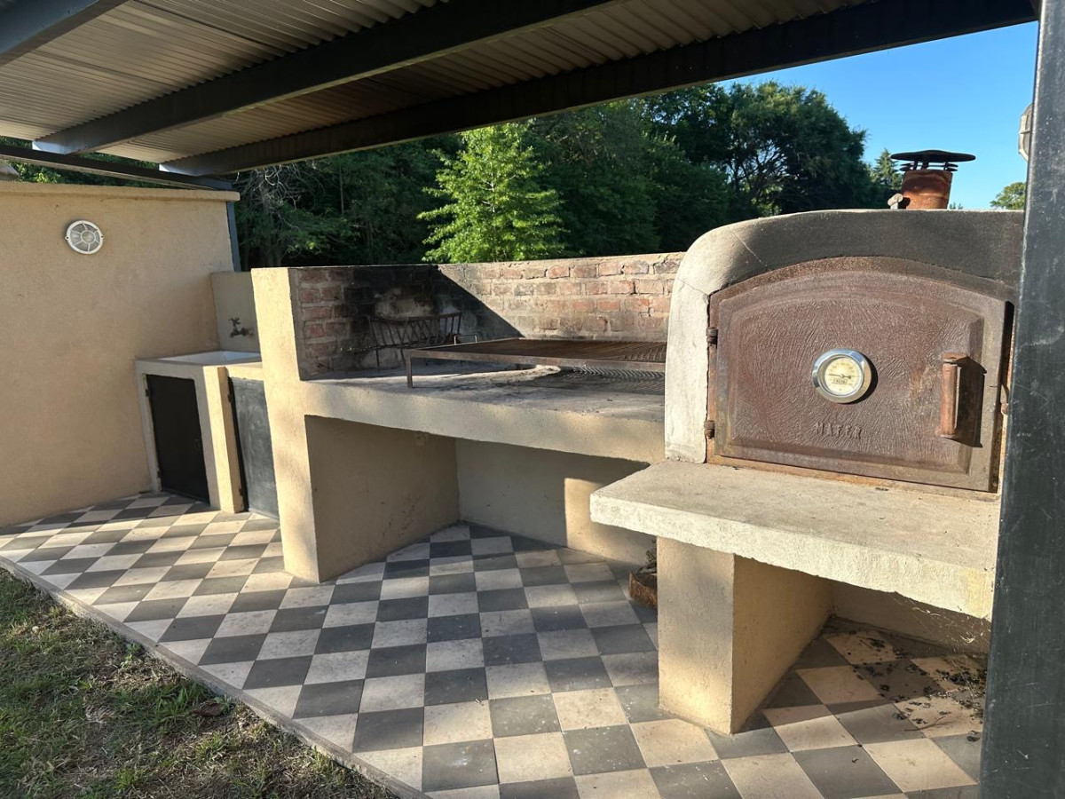 En el exterior: pileta de 11m x 4m con bomba y filtro en perfecto funcionamiento, y con un solarium de 5m x 4m, parrilla, horno de barro, pérgola, fogón, amplios gabinetes de depósito, mesas y bancos de cemento y arboleda.